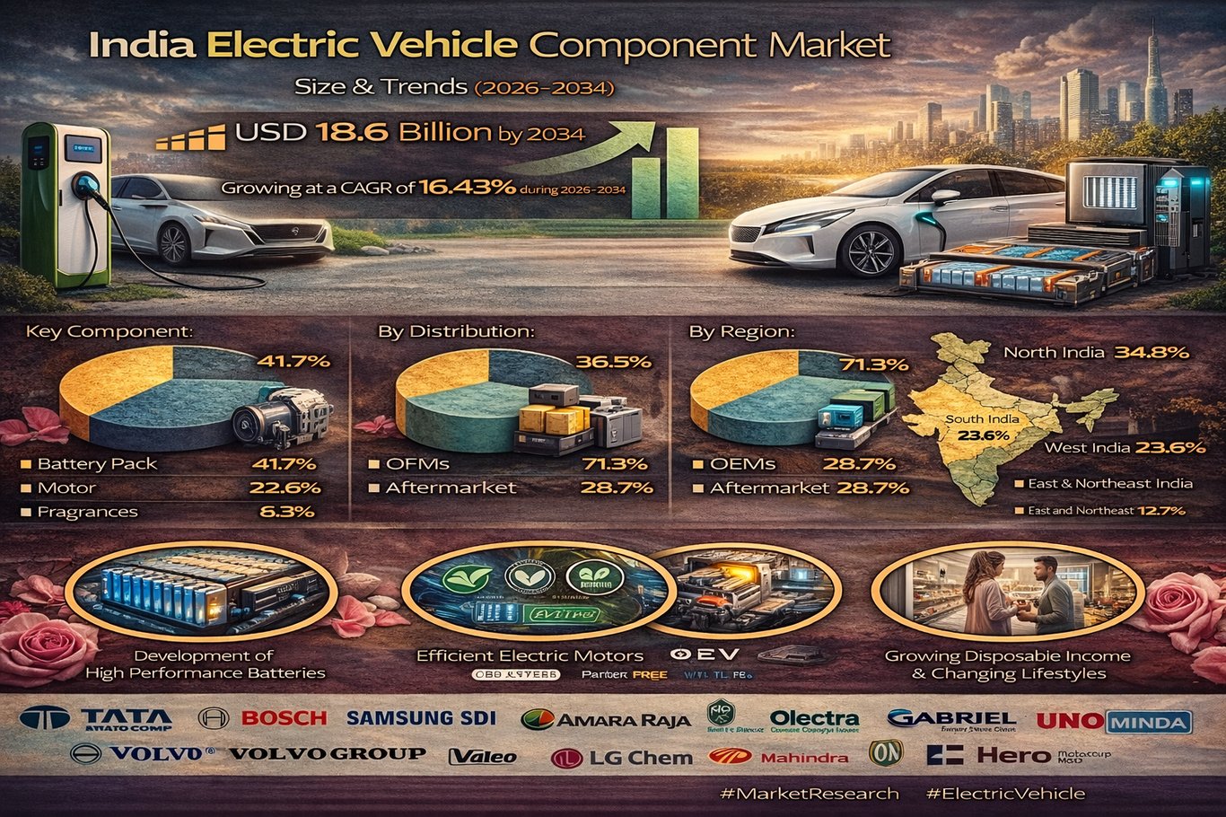 According to IMARC Group’s report titled "India Electric Vehicle Component Market Size, Share, Trends and Forecast by Component, Distribution, and Region, 2026-2034" the report offers a comprehensive analysis of the industry, including market share, growth, trends, and regional insights.