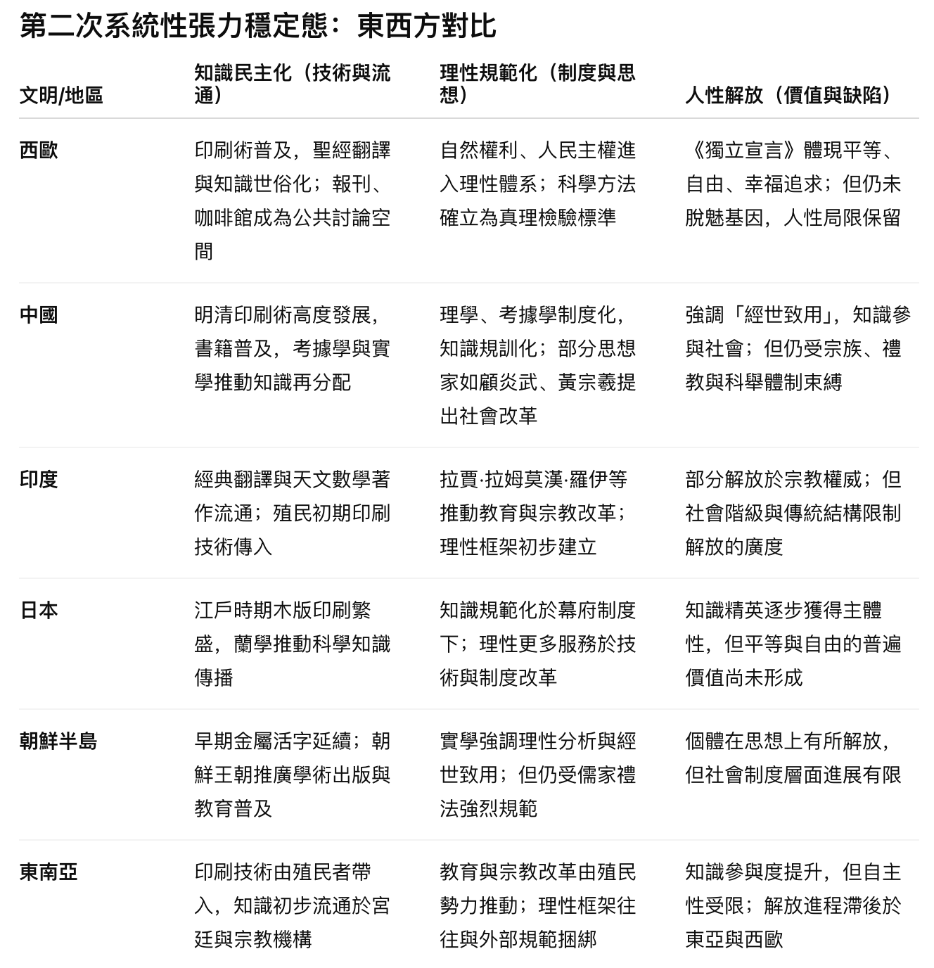 這第二次系統性張力穩定態,是一次巨大的飛躍,它在歷史的進程中留下了不可磨滅的印記。它既有承繼軸心時代「人類自主性」的輝煌,也帶有其內在的「回落」與局限。