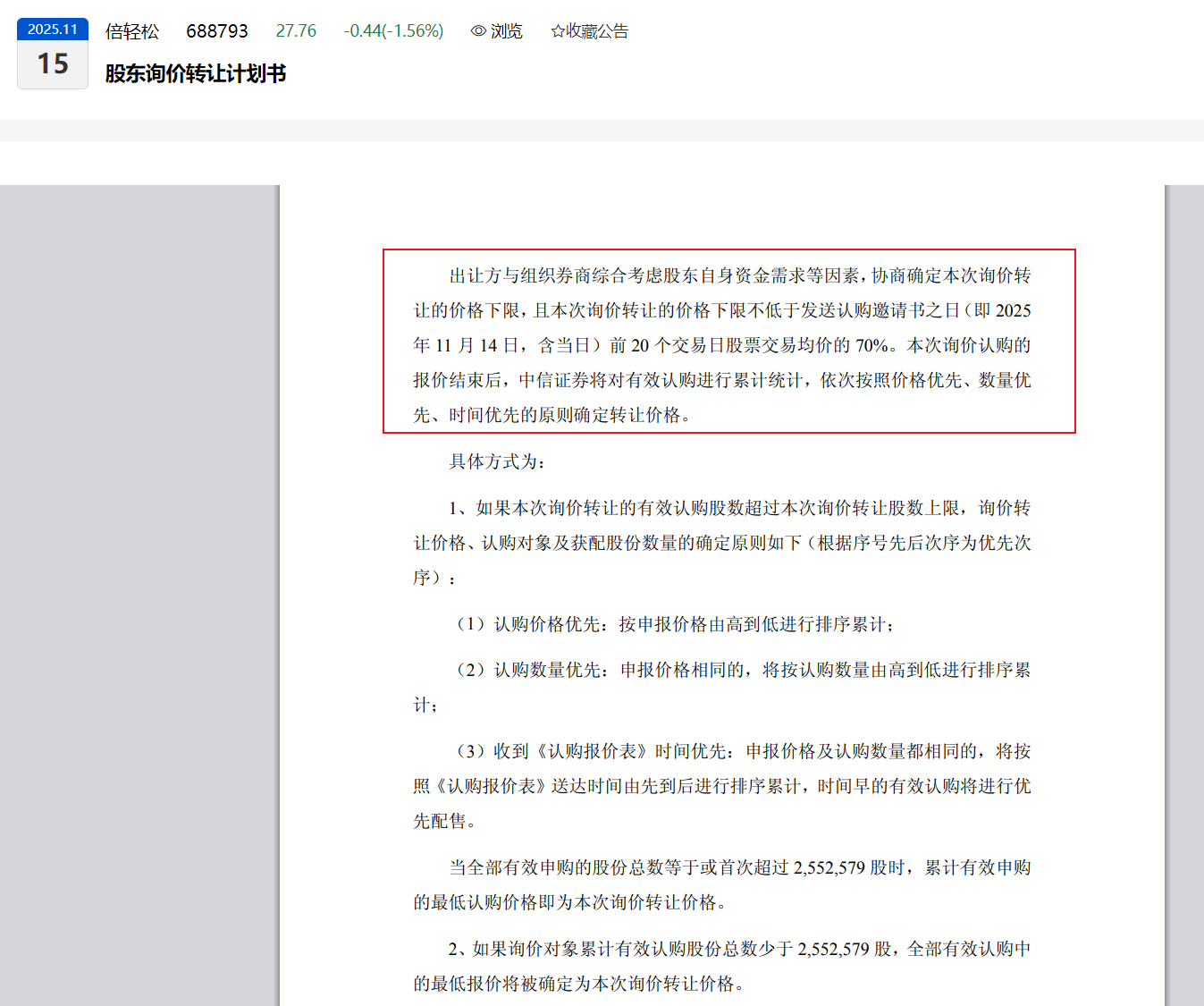 本次询价转让的价格下限不低于发送认购邀请书之日(即2025年11月14日,含当日)前20个交易日股票交易均价的70%。公告中的这句话很关键,规定了价格下限,但没有规定价格上限,也就是说,机构方可以溢价购买,那就看最后机构方给什么价格了。