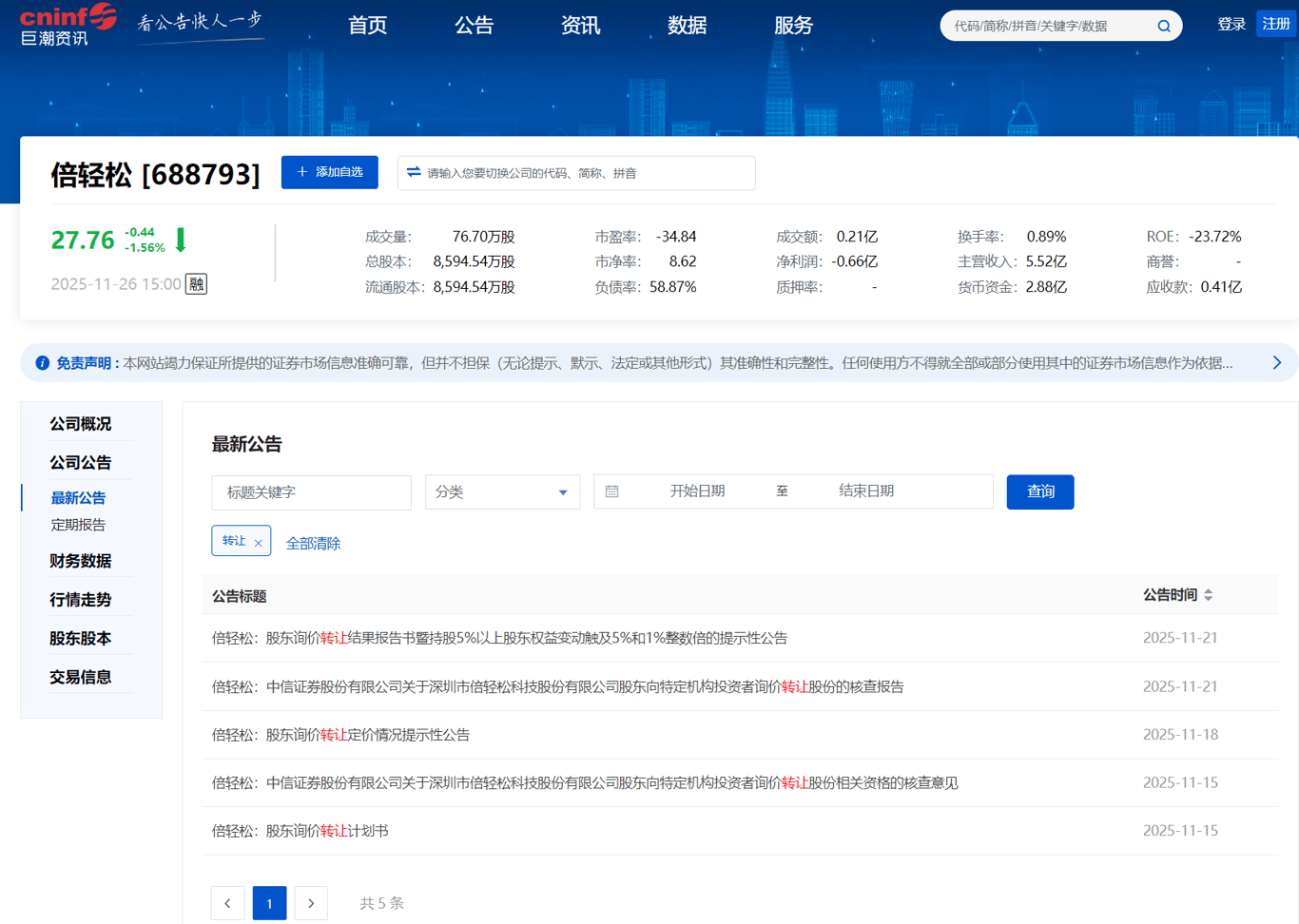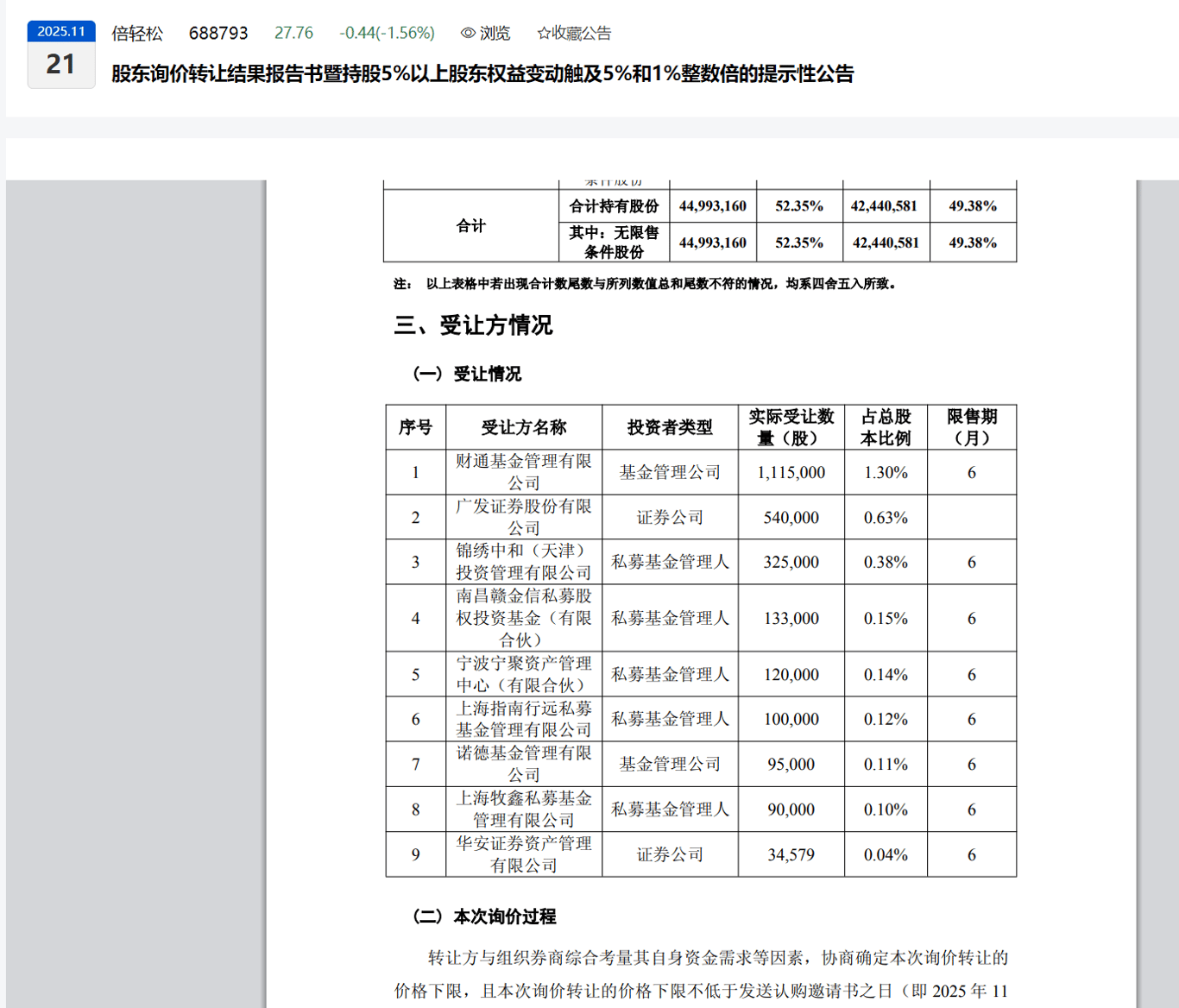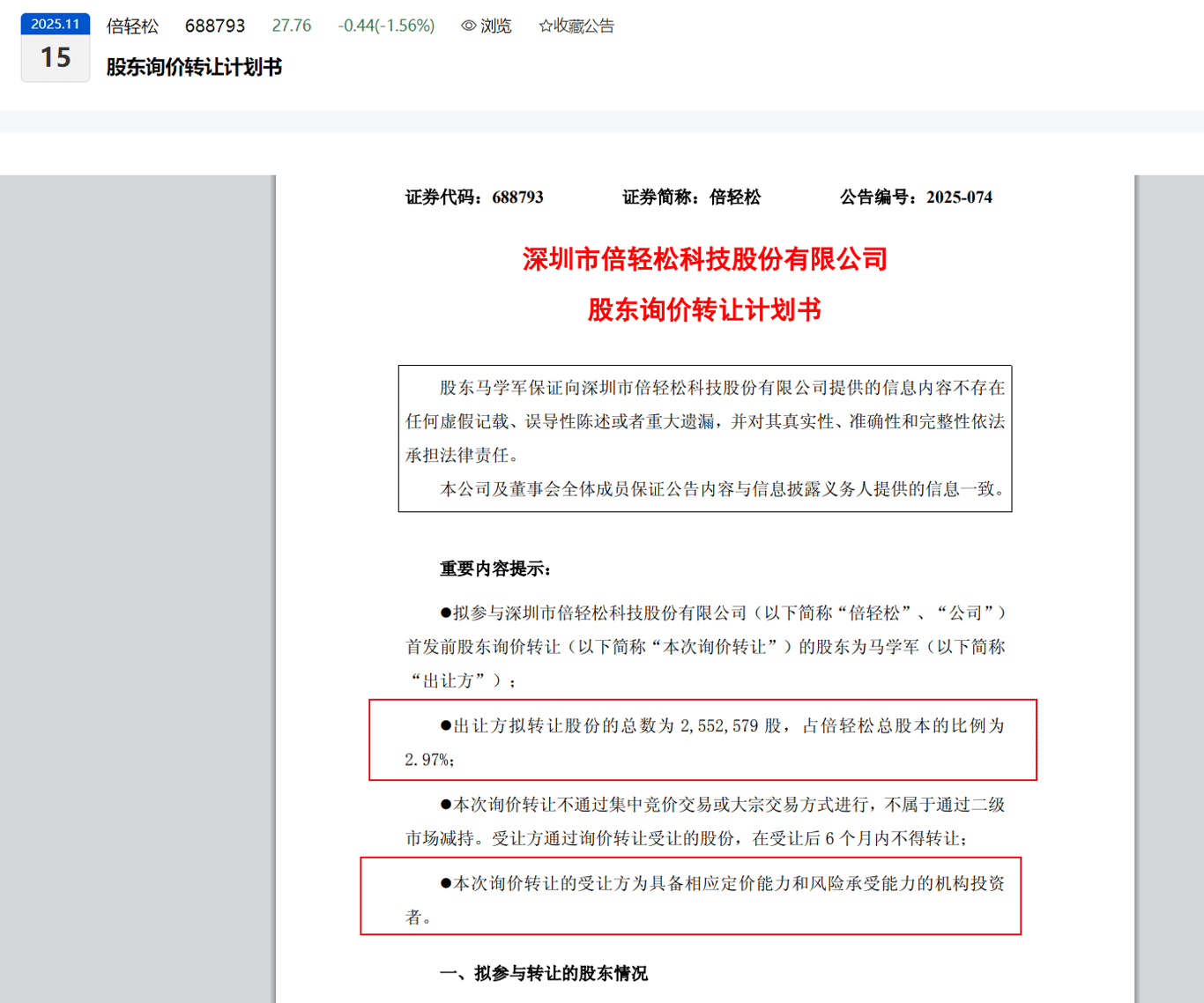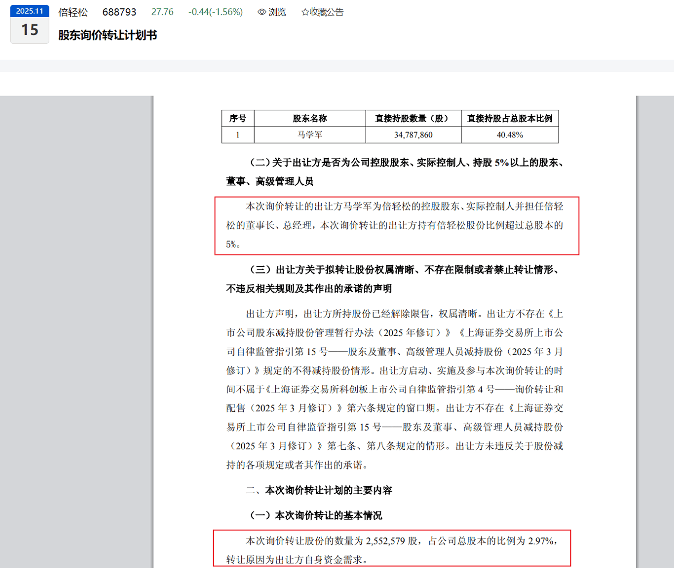 该公告内容显示:本次询价转让的出让方马学军为倍轻松的控股股东、实际控制人并担任倍轻松的董事长、总经理,本次询价转让的出让方持有倍轻松股份比例超过总股本的5%。