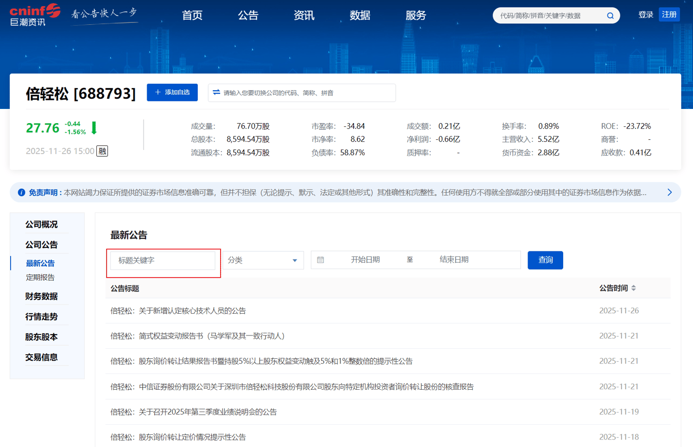 输入关键词“转让”,与转让有关的公告,就都搜索出来了。不过巨潮只能关键词搜索标题,如果要搜索正文内容,得使用其他公告搜索工具,如果不想付费,可以用搜索引擎搜索公告正文内容,多找一下。