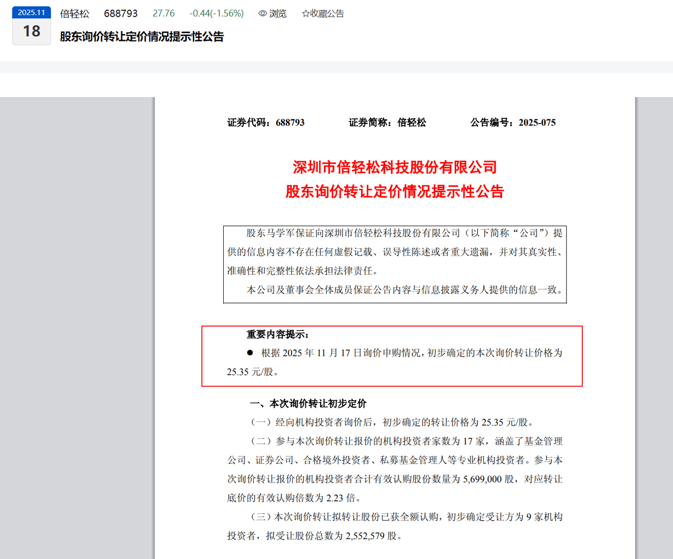 3、接下来的重磅公告就是《股东询价转让定价情况提示性公告》,这份文件最关键的一句话是:根据2025年11月17日询价申购情况,初步确定的本次询价转让价格为25.35元/股。