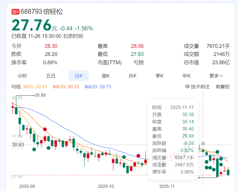 这意味着,如果你在11月17日当天,用30.14元买入一股倍轻松,你的成本比机构方高出了将近5块钱!