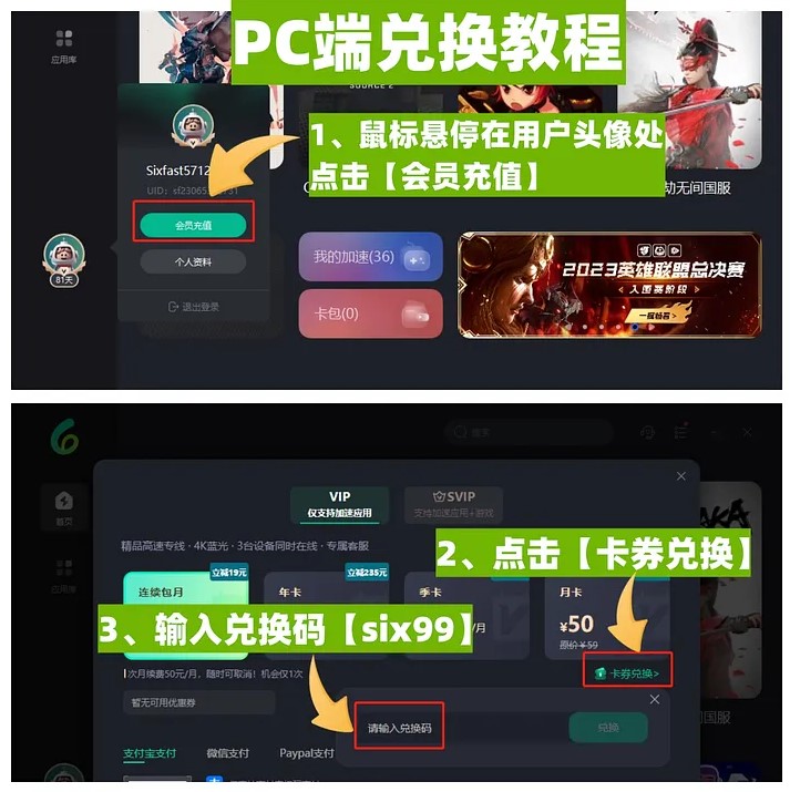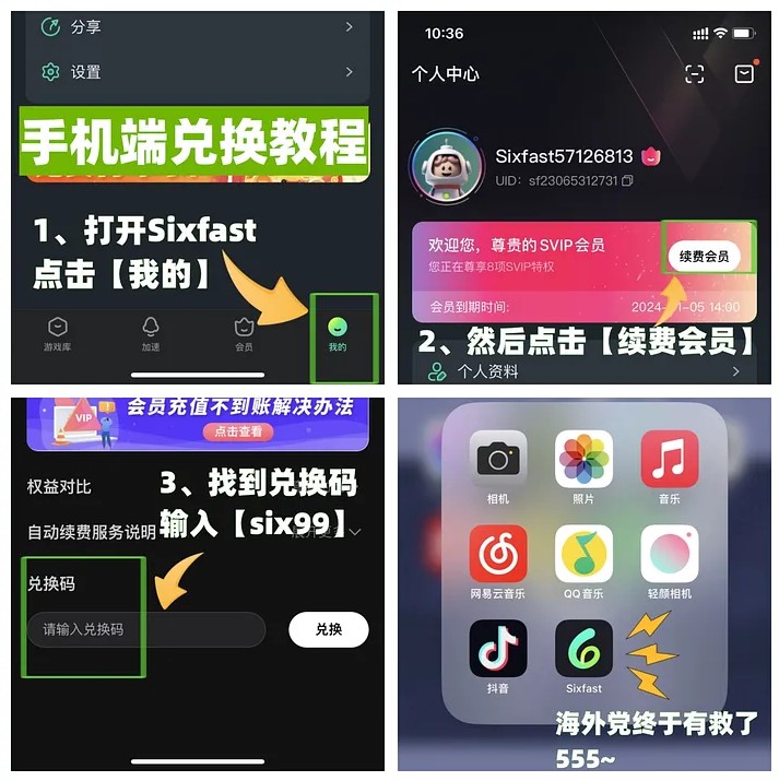 有一些在海外的玩家,在玩《逆水寒》时发现会出现高延迟、卡顿,或者是进不去的情况,其实是因为《逆水寒》是中国开发的游戏,因此在海外玩的时候,由于服务器物理距离较远,会导致上述卡顿的情况。这个时候推荐使用Sixfast,能够一键降低ping值,解决高延迟、卡顿的问题。这里再教大家怎么免费使用Sixfast,一起来薅羊毛啊哈哈哈哈 — — 手机端用户可以在Sixfast【我的】中点击【续费会员】兑换码内填【six99】,电脑端在Sixfast左侧【会员充值】找到【卡券兑换】填【six99】,直接在Sixfast官网注册登录后,在【个人中心】【兑换码】处填【six99】就能领取免费时长啦~