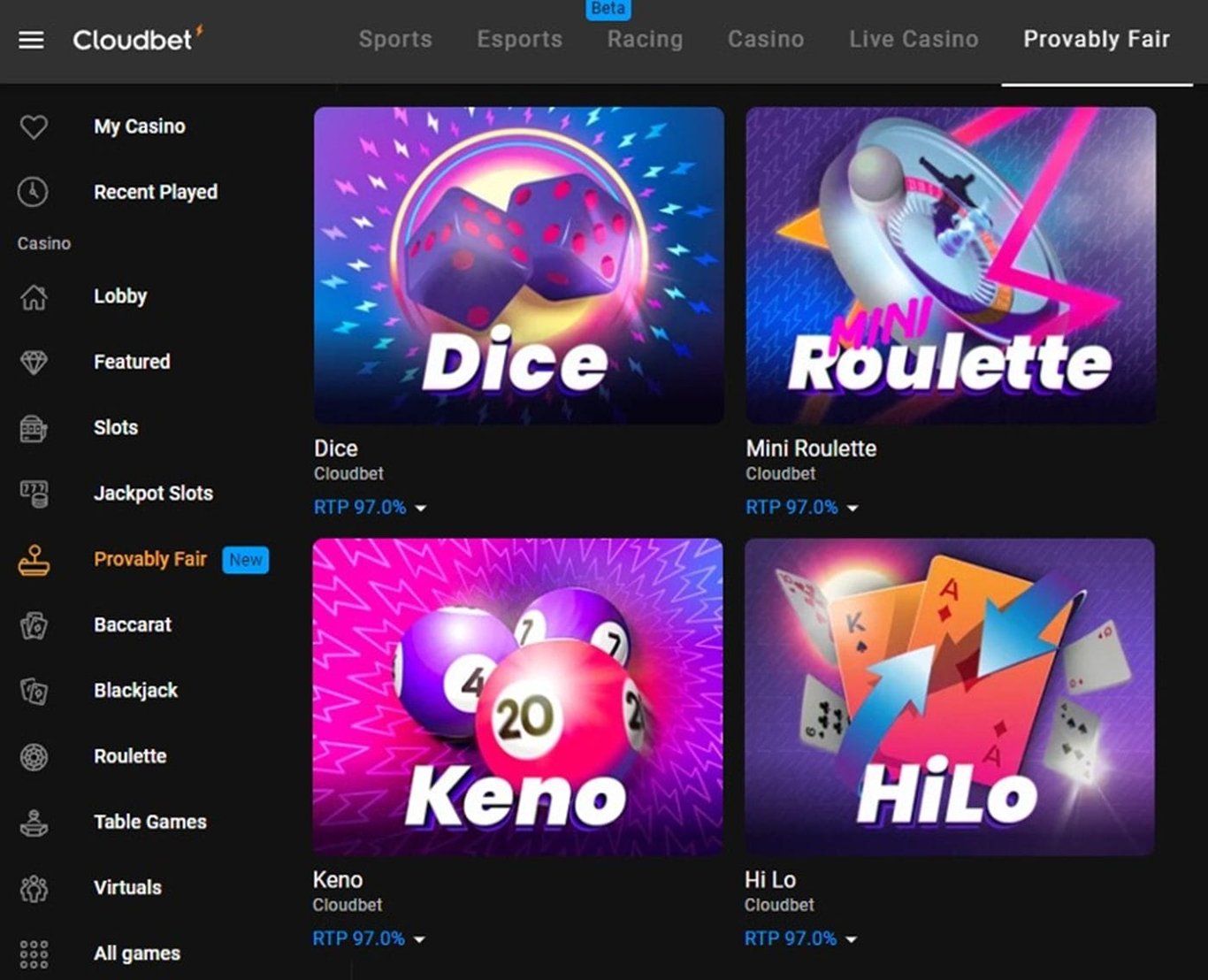 在桌遊中,擲骰遊戲一樣深得玩家喜愛。加密貨幣粉絲亦可選擇比特幣擲骰。 Cloudbet娛樂場提供骰寶、花旗骰和可證明公平的比特幣擲骰變體遊戲,RTP為97%。 Cloudbet花旗骰遊戲的娛樂場優勢較低,RTP為98.6%,骰寶的RTP為 97.22%。