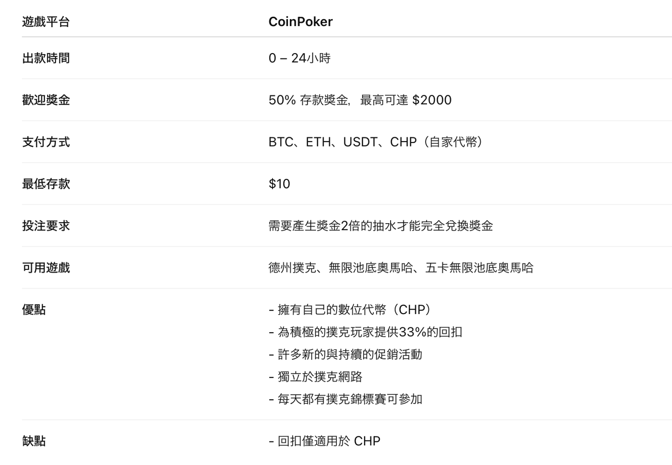 我們推薦而不是其他任何線上撲克網站,理由充分。 CoinPoker於2018年推出,自那時以來,該網站吸引了許多撲克玩家。主要的撲克變體包括德州撲克、底池奧馬哈和5張底池奧馬哈。