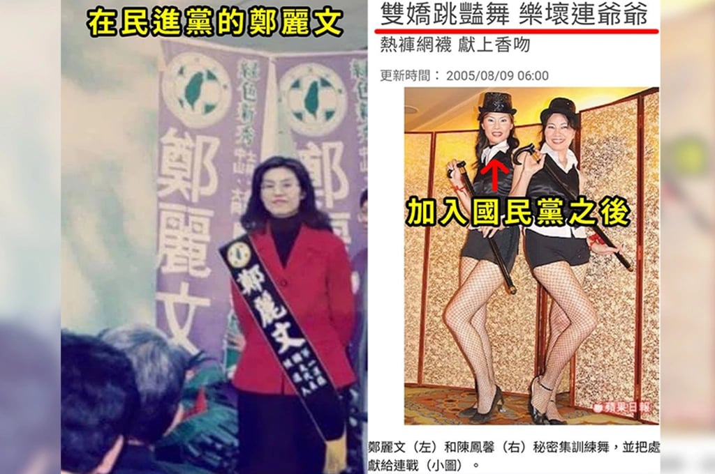 根據曾編輯黨外雜誌的攝影師邱萬興描述,1996年國大代表選舉,鄭麗文代表民進黨參選,以台北市第一選區最高票當選國代。2001年她投入民進黨北區立委初選失敗,鄭麗文開始上同樣是民進黨出身、離開民進黨的資深媒體人陳文茜主持的政論節目,批評民進黨,開始和民進黨漸行漸遠。2002年發生的代理衛生署長涂醒哲「舔耳案」,鄭麗文在節目上對涂醒哲進行一些負面揣測,遭到民進黨停權,鄭則隨後宣布退黨。當時鄭還哭稱,絕不會加入這個她過去揚言要消滅的國民黨。不料三年後,鄭加入國民黨,因為鄭攀上國民黨主席連戰,她更在連戰生日時身穿「兔女郎」服飾為連戰祝壽。