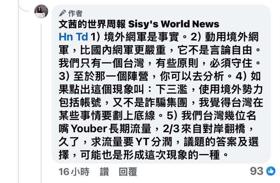 這場選戰,讓過去曾幫助鄭的趙少康、陳文茜徹底與鄭麗文切割。趙系統的飛碟電台、News 98的《飛碟午餐》、《世界一把抓》主持棒曾給了沒有公職時期的鄭。然而,此次選戰中,趙少康指控「境外勢力」介選,散發攻擊郝龍斌甚至他的消息,當時趙拋出希望6位參與國民黨主席選舉的候選人共同出聲譴責,疑似劍指鄭麗文。而國民黨內這樣的消息其實已經傳出許久,各候選人都心裡有數,但只看到趙少康出面指控,隨後張亞中在最後一場電視辯論會後點名鄭麗文。而鄭也從未正面回應,僅強調團結、網路言論的確真偽難辨,四兩撥千金。此時,網路風向開始帶往嘲諷趙的方向帶,包括嘲笑將趙與民進黨激進支持者八炯做類比,稱其為「藍鳥八炯」,讓趙在藍營內部的公信力受到挑戰。而趙的好友陳文茜則在她的Facebook粉絲專頁上提出境外網軍是事實,並強調動用境外網軍比國內網軍更嚴重,「我們只有一個台灣,有些原則,必須守住」。此外,陳文茜更提到台灣幾位名嘴YouTuber長期流量,2/3來自對岸翻牆,久了追求流量分潤,議題的答案及選擇恐形成這次選舉的現象。