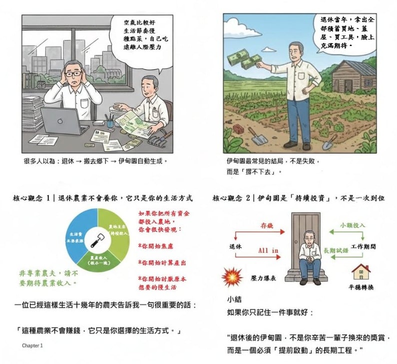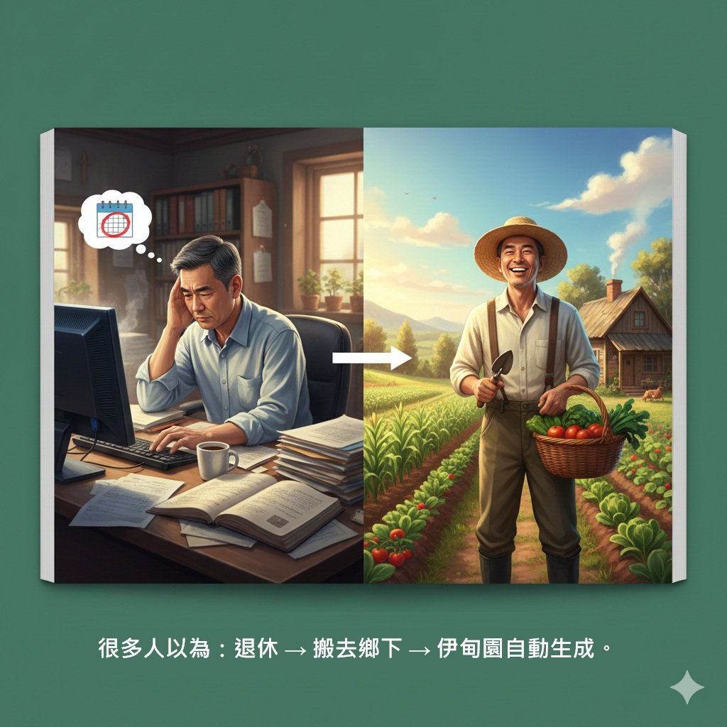 Chapter 1|退休伊甸園不是獎賞,而是一個長期工程Anne·12 月 15 日(修改过)·IPFS·翻译成简中退休後,你夢想的伊甸園可能是慢生活、清新空氣、健康蔬果與悠閒節奏,但現實往往比想像複雜。本書將帶你認識鄉下生活的真實挑戰——體力負荷、孤獨感、技能需求與財務風險,並提供可操作的方法與策略。透過小規模試做、資源整合與逐步投入,你能提前檢驗自己的能力與資源,掌握可持續生活的方法,讓你的伊甸園不只是夢想,而能真正落地持續經營。 Made by Gemini Made by Gemini Made by Gemini Made by Gemini Made by banana田園夢退休伊甸園CC BY-NC-ND 4.0 授权已推荐到频道:时事・趋势、书音影建议频道选择希望推荐到的频道(单选)生活事书音影旅・居性别/爱创作・小说时事・趋势身心灵没有适合的频道不参与频道推荐 (文章将出现在「还有」中)下一步喜欢我的作品吗?别忘了给予支持与赞赏,让我知道在创作的路上有你陪伴,一起延续这份热忱!支持作者支持作者Anne我對世界的多樣始終懷抱好奇。領域越繁複,我越想理解其中脈絡。寫作於我,是理清思緒、看見自己與世界的方式,也是在混亂裡留下一束清晰的光。来自作者相关推荐專業的國王新衣:從九千元的垃圾認證,到被包工討厭的監造活在當下2025,我終於不再孤單地面對自己的內心