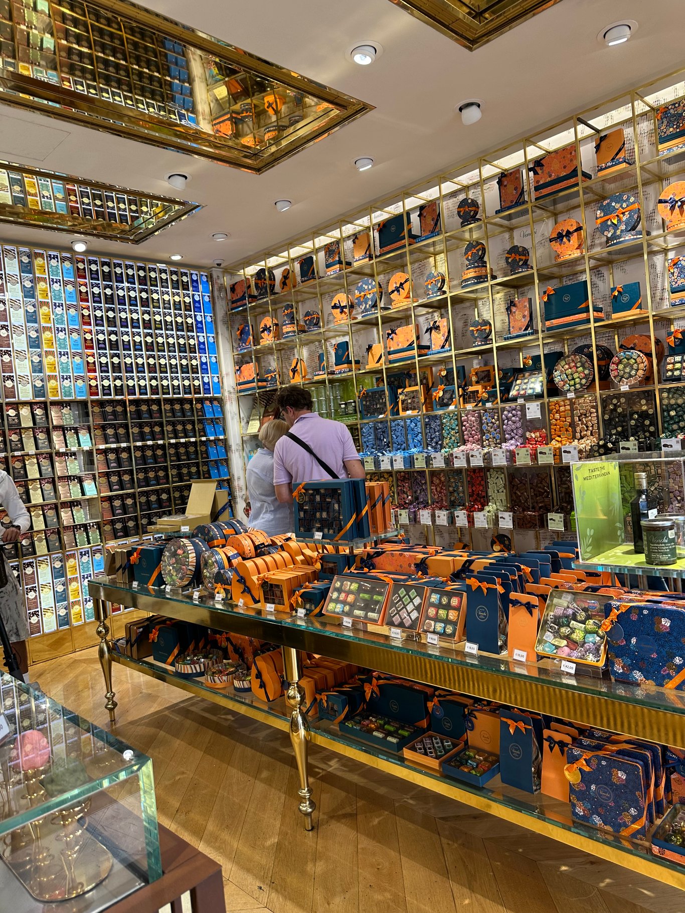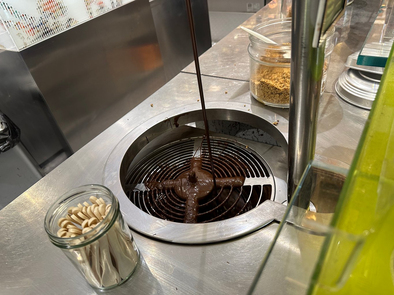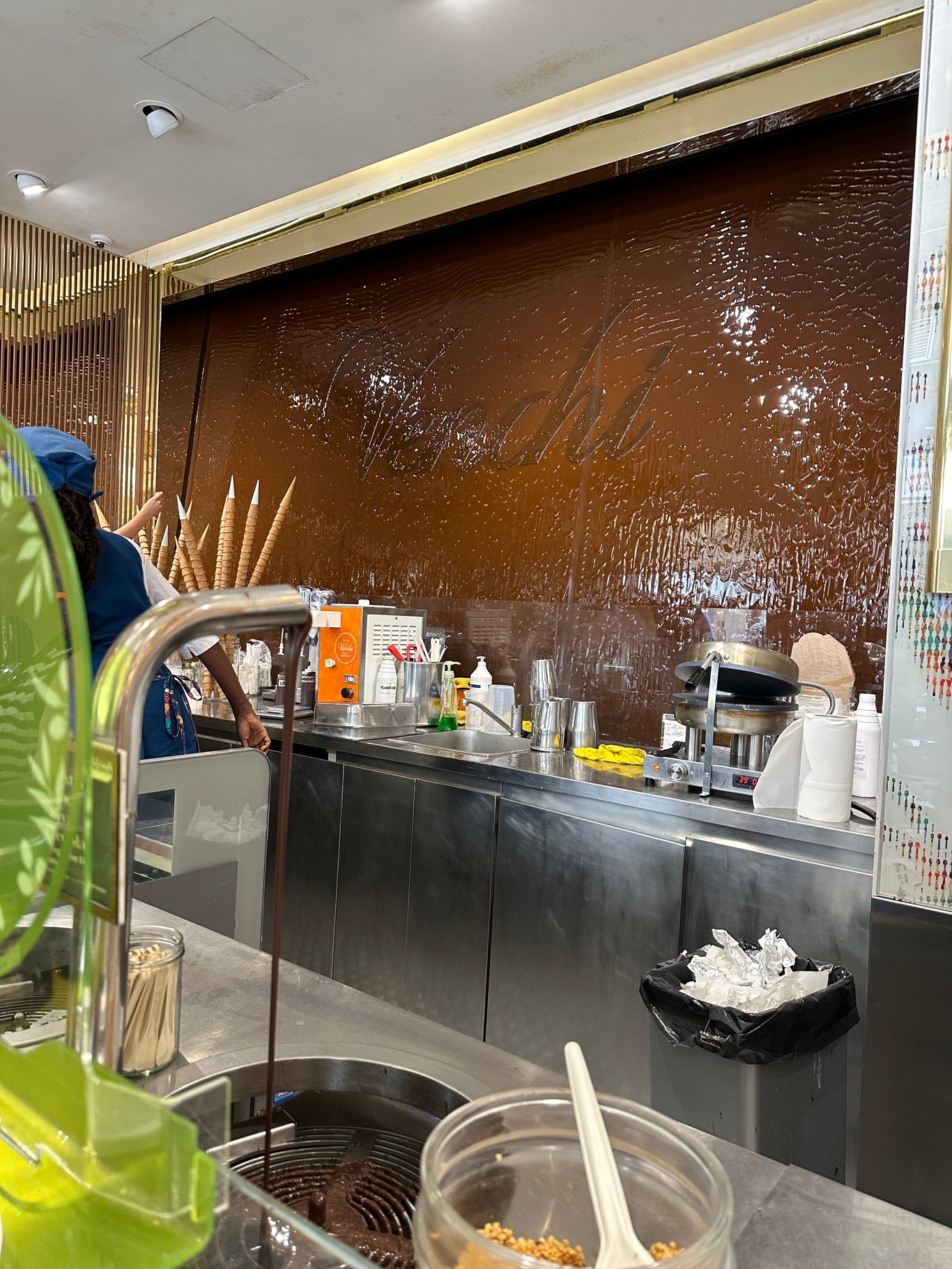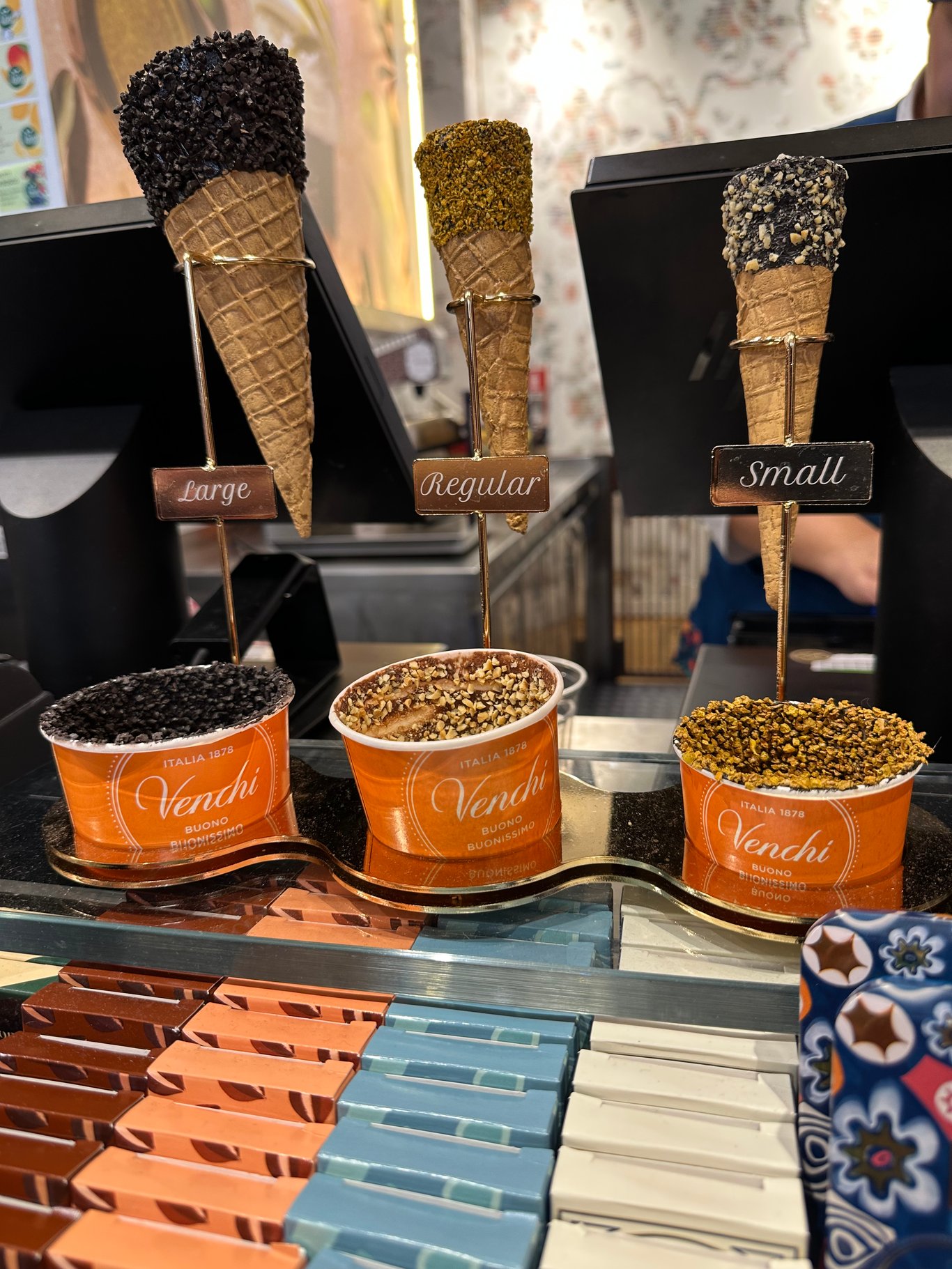 等我们到了佛罗伦萨,那更是敞开肚皮来吃。而且在他们的购物中心,好多venchi 的店。这是一家连锁店,看着墙上的流动巧克力,以及店里琳琅满目的各种颜色的巧克力,哪里还走得开?