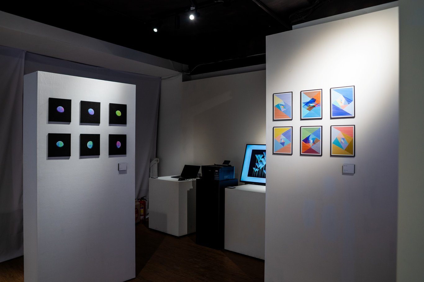入口處往遠處望去,矗立的中央牆面,不僅是內部展區動線的樞紐,更是概念的錨點。牆上陳列的生成藝術印刷品,標誌著數位媒介與物質世界的交織。其刻意將其置於「生成過程」與「最終結果」的物理中介點上,讓原屬於螢幕的數位演算法,以實體物質的形式強迫觀者凝視。這種「數位誕生、實體存在」的小矛盾,正是策展人無形中感知的、關於當代藝術在虛實交界處的張力與邊界。