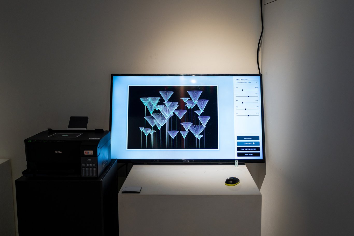 黃新說明,自己這次設置列印互動,出發點在於思考生成藝術的未來走向,或許可以更貼近觀眾的生活。此次設置,挑選了幾個創作者的作品,以及黃新自己的作品,讓觀眾可以調整參數,將作品列印成明信片帶回去。他也提及,開幕那天,有位觀眾列印了所有創作者的作品後,很興奮地請創作者在明信片上簽名。