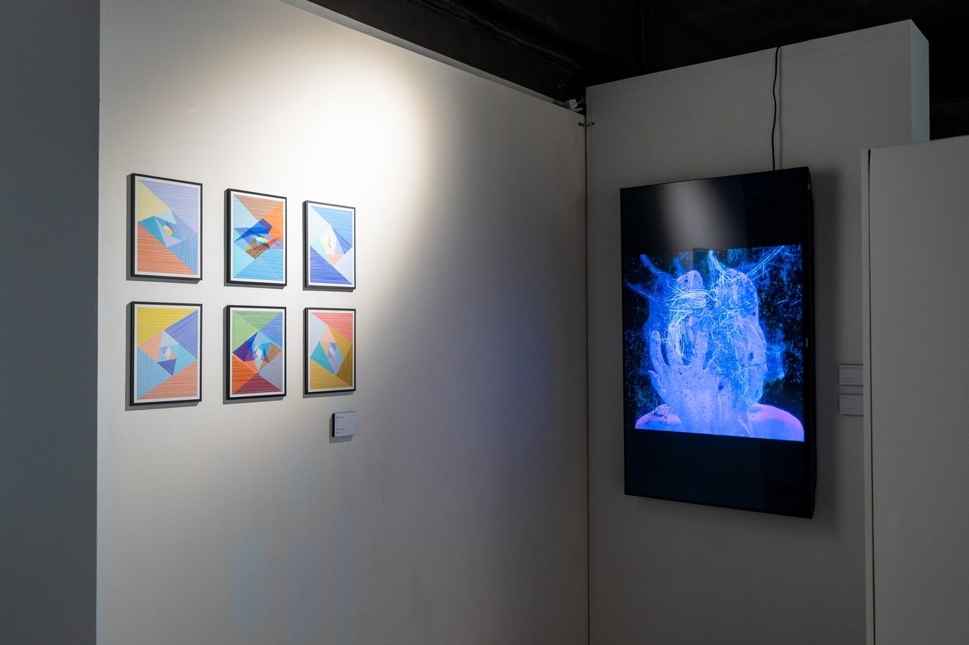 周湧秝的《H O M E》呈現了星球的光影,整體彷彿是星際的探險挺在駕駛艙發現星球時會映入眼簾的畫面。馮妍嘉的《無盡》,以分割的線條,把玩比例與色彩的變化。蔡政峰的《Paradox》以細緻的藍色線條,赤裸呈現創作者的心境。陳柏硯的《日常》捕捉了夜晚的肅靜與隨著指針變化而產生的游離。