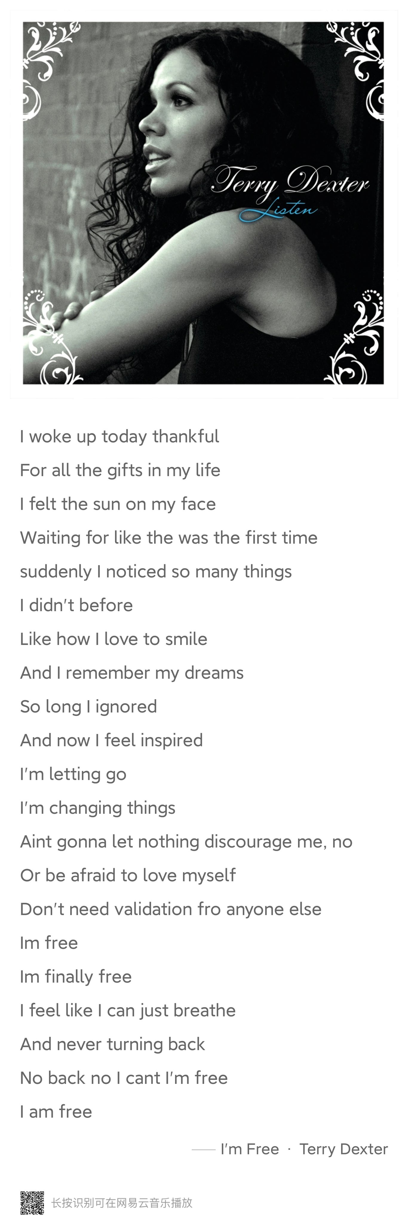 Terry Dexter《I'm Free 》图片中形容自由和新生状态,就是我对25年的感觉。
