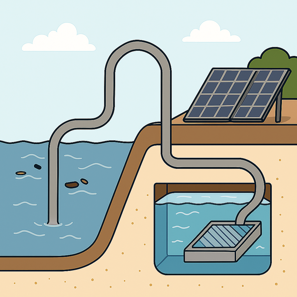 當潮漲時,海面水位高於坑內水位(平均潮差約 1.0–1.4 公尺,春潮時可達 3 公尺),利用太陽能供電的小型真空泵,先將管內空氣抽出,使整條管路充滿海水,啟動虹吸作用。此時,海水會自動流入坑槽,並攜帶表層漂浮垃圾進入系統。
