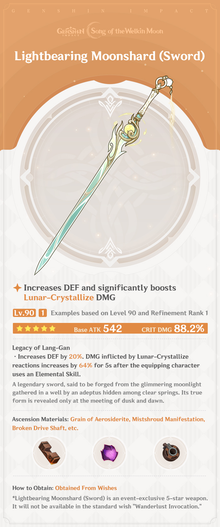 "Grants a 12% All Elemental DMG Bonus. When the wielder triggers a Crystallize reaction, or hits an enemy affected by a Crystallize shield (Lunar State), they gain 1 stack of 'Moonlit Gallop.' Each stack increases Movement Speed by 5% and ATK by 8% for 10 seconds. Max 3 stacks. When the wielder possesses 3 stacks, their Charged Attack DMG is increased by an additional 24%."