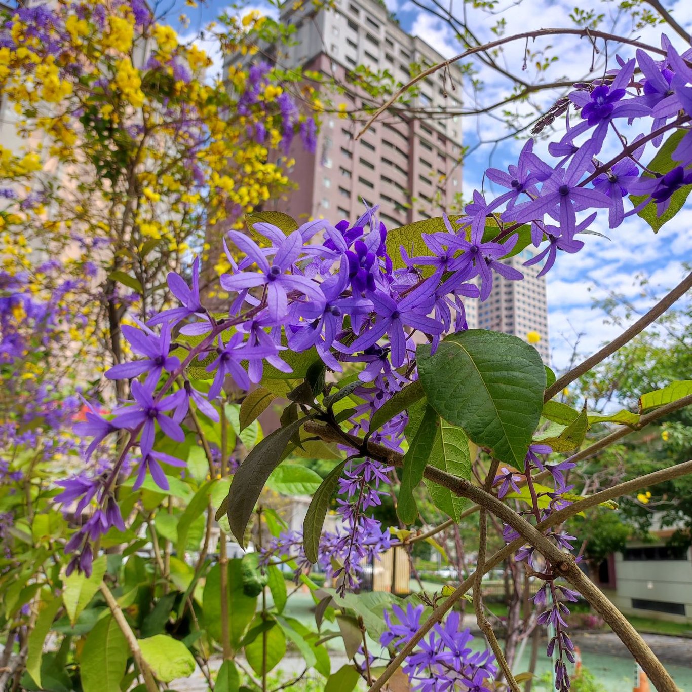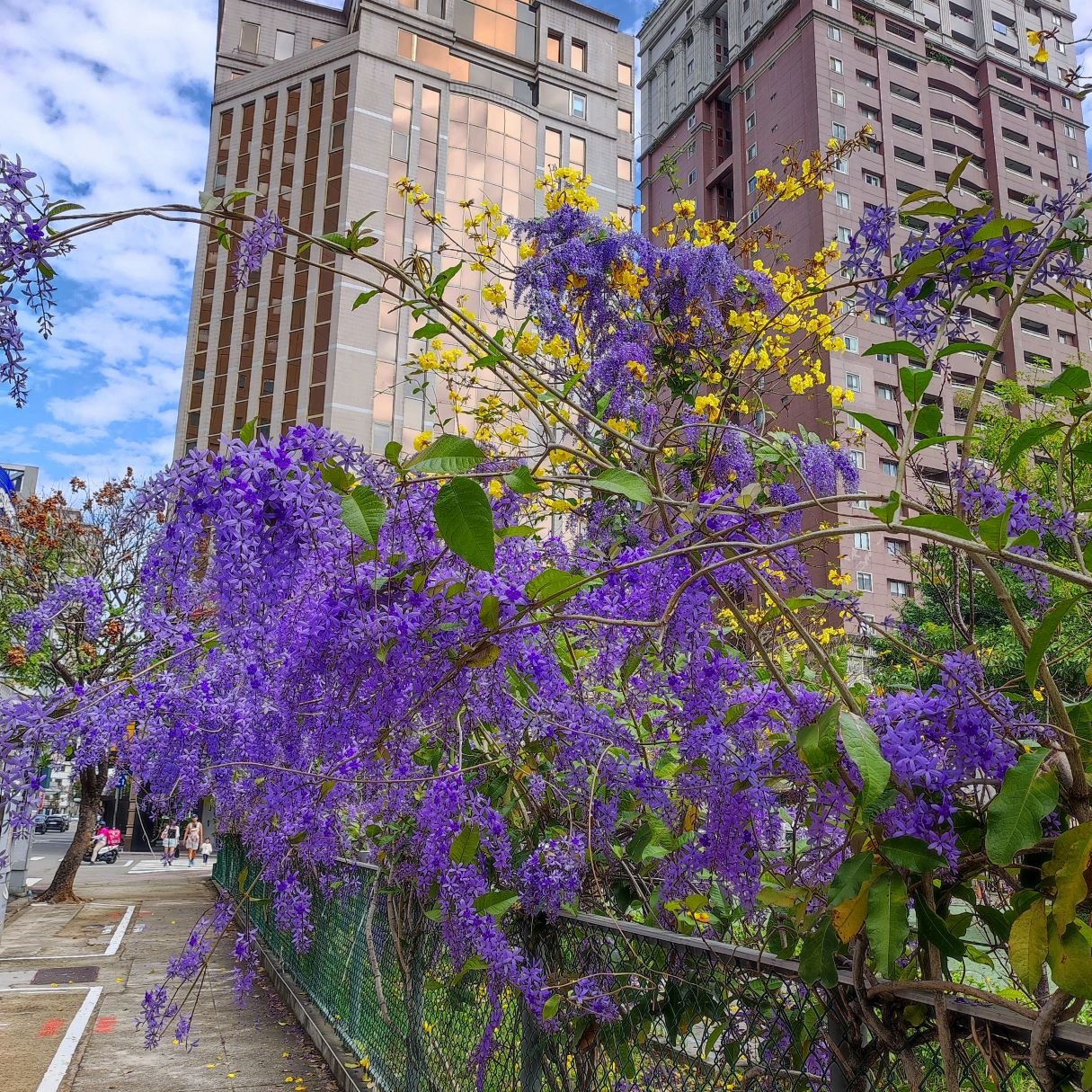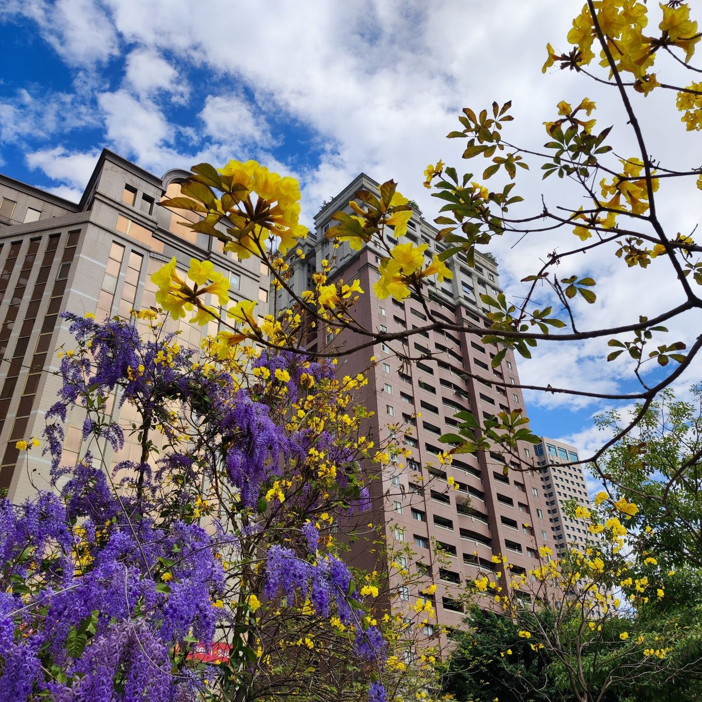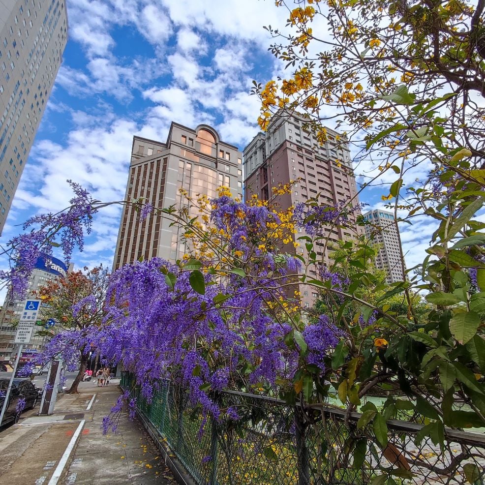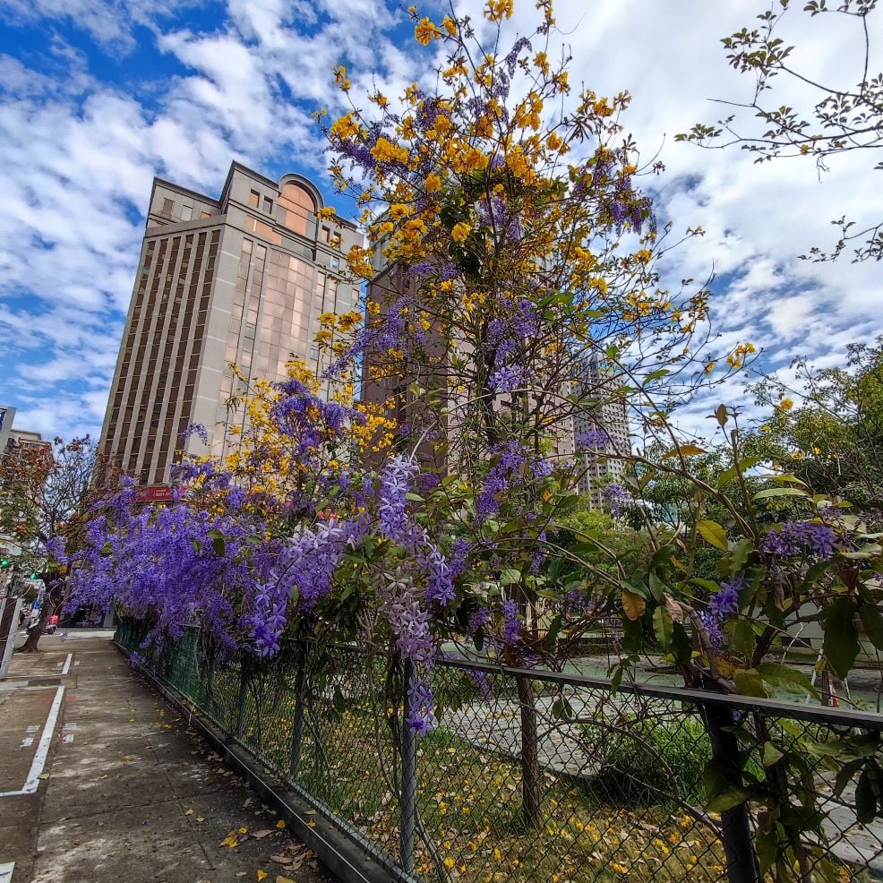 今天本來要聊別的,結果中午經過台中中正國小時,看到藍花藤與黃花風鈴木開的正艷,遠方碧空澄淨,白雲朵朵,整個色彩對比強烈,重點是路邊剛好有停車格,就開開心心的停車下來拍照~