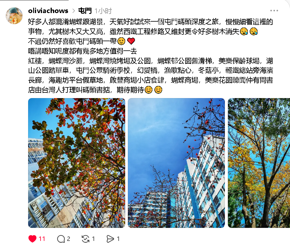 “ 好多人都混淆蝴蝶跟湖景邨,天氣好試試來一個屯門碼頭深度之旅,慢慢細看這里的事物,尤其樹木又大又高,雖然西鐵工程修路又維封更令好多樹木消失...