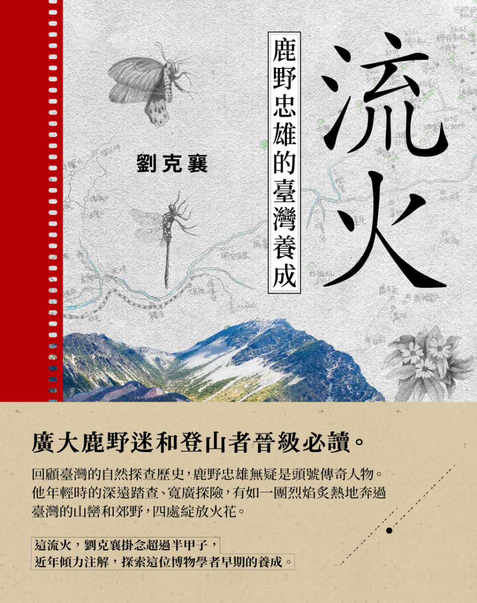 劉克襄:我從我最近的作品、2024年底出版的《流火:鹿野忠雄的臺灣養成》談起。《流火》的主角鹿野忠雄是個傳說也是個傳奇,他1925年來台求學,進行台灣山林的踏訪。你們看照片中的他,穿的是像今天的Patagonia、始祖鳥這種名牌登山服飾。但最迷人的是,穿著名牌來台探險的他,完成的不管是民族學研究、高山攀爬、考古學乃至昆蟲調查,都非常傑出。