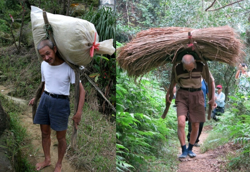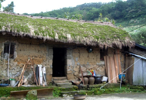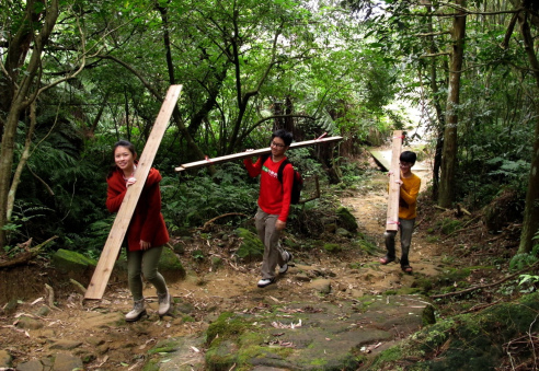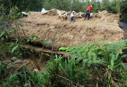 所以你們就看到這個畫面,很多年輕人都來搬木頭上山,認同這個家園。阿公看了也跟著搬,用傳統的支架背茅草。白茅的種植不容易,需要犧牲茶園,例如十甲的茶園犧牲一甲來種,而且要累積4年才夠蓋一間屋頂,很辛苦。但我們志工願意扮演協助興建茅草屋的角色,而且我們用的是山中的月桃繩子在綁茅草,維持傳統的工法,比日本合掌村用鐵絲還傳統。
