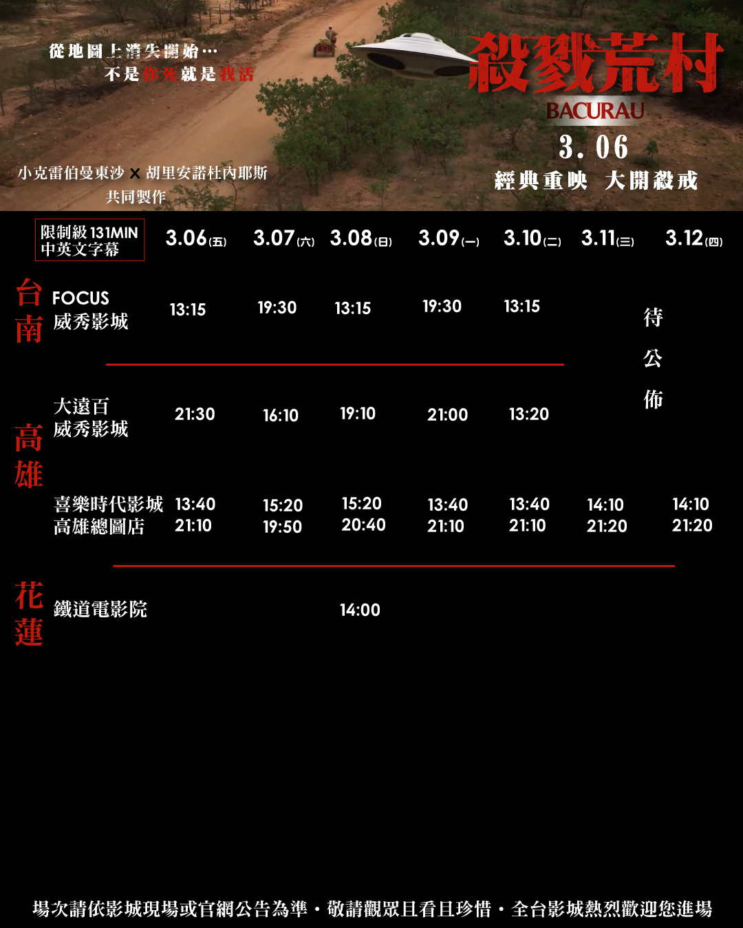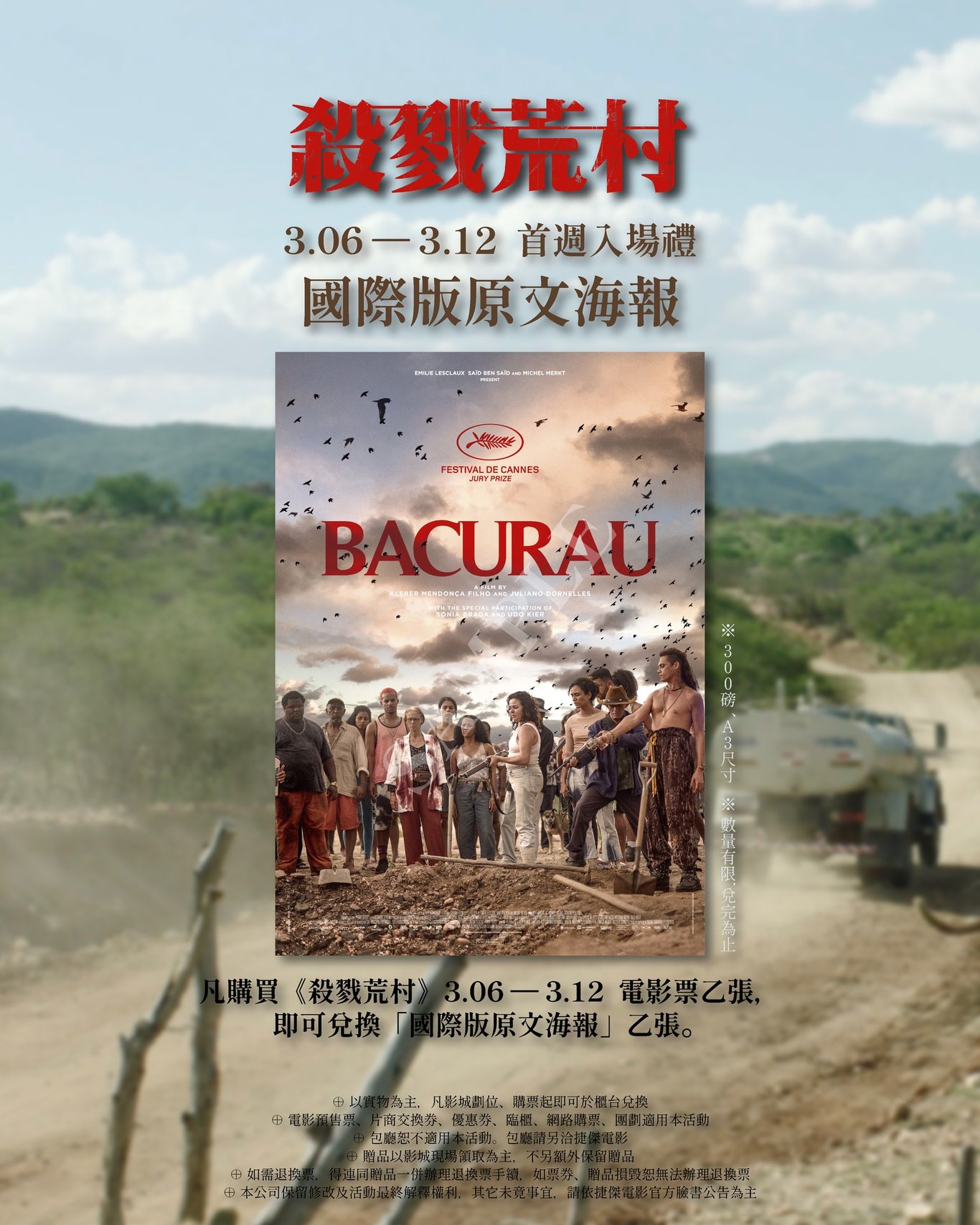 想一睹巴西導演克雷伯‧曼東沙‧費侯(Kleber Mendonca Filho)與胡里安諾‧杜內耶斯(Juliano Dornelles)精彩的反思政治寓言之作,2026年3月6日千萬別錯過在台上映的電影《殺戮荒村》(Bacurau)。