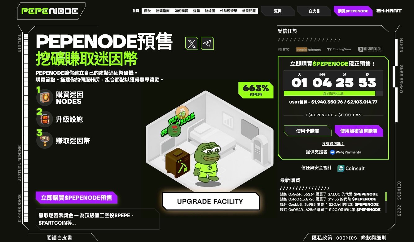Pepenode($PEPENODE)代表著迷因幣的另一種演化,將挖礦機制與遊戲化體驗結合,打造「Mine-to-Earn」模式的新生態。該專案以Pepe文化為靈感,讓玩家能在虛擬礦場中模擬挖礦過程並獲得代幣獎勵,將傳統挖礦的高門檻轉化為趣味參與。對一般使用者而言,Pepenode提供了一個輕量、可玩且有實際收益的投資入口。