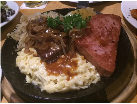 這盤 Calwer-Eck-Pfännle 雖然賣相奇妙,但充滿了滿滿的蛋白質與卡路里,大口吃肉配上起司麵疙撘也有解膩的酸白菜與沙拉,再配上麵包和啤酒;