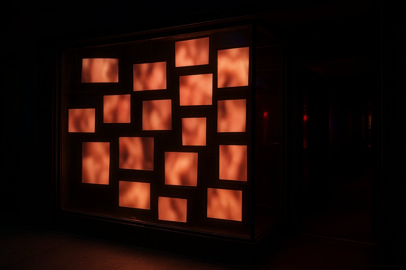 對街轉角有一家宛如夜店般的餐廳? 室內燈光昏暗,零碎的霓虹在深處閃爍。門口那整面巨大的玻璃上,凌亂的貼滿不對稱的平板,螢幕大小不一,上下錯落,約莫十到十二吋。螢幕裡不斷循環播放著肉色的、模糊的人體影像與片段,在玻璃上反射出奇異的光。