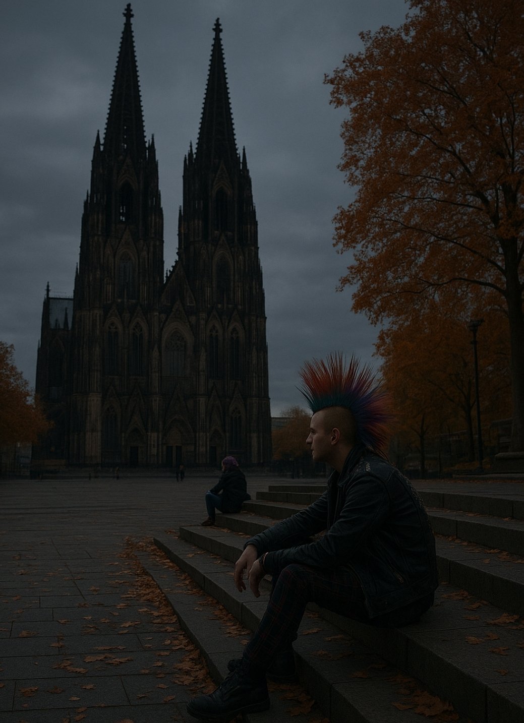 依稀感覺在歐洲,一股入秋的蕭瑟感。天色漸暗,夾著毛毛雨的陣風,打落一地的黃葉。似科隆大教堂廣場前,一群頭髮染成五顏六色的龐克族,坐在階梯與石礅扶手上,嘻笑怒罵。