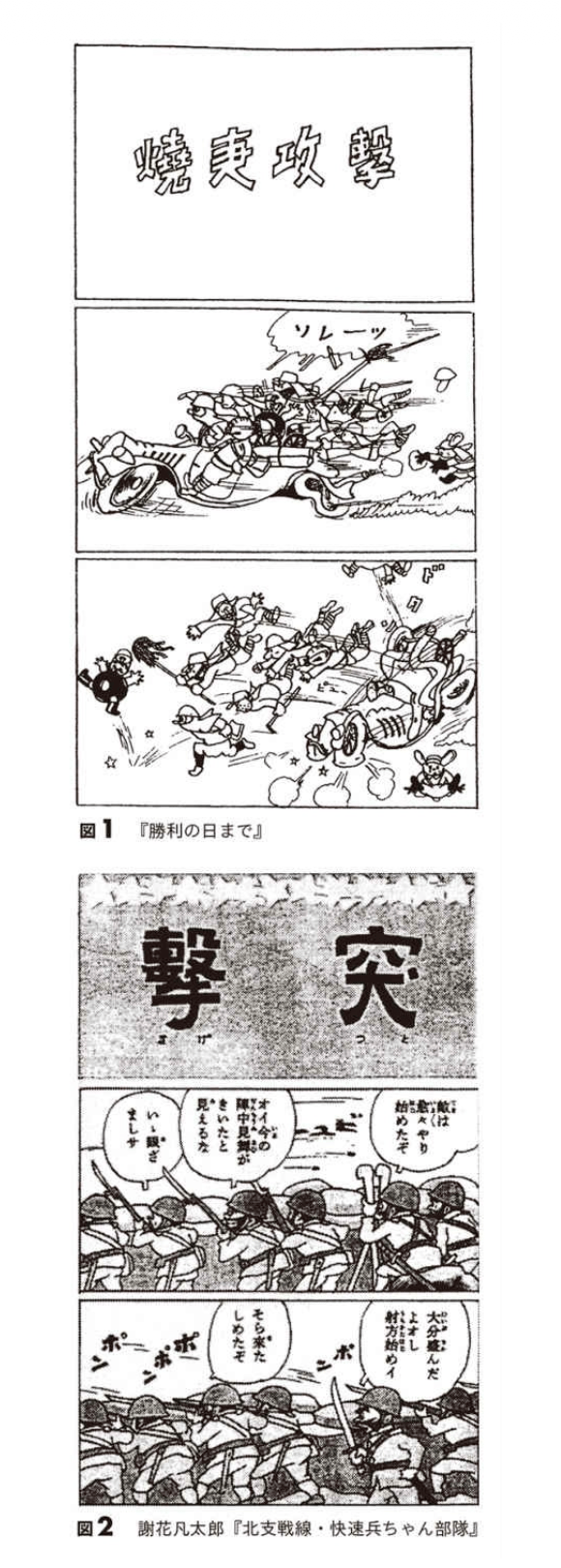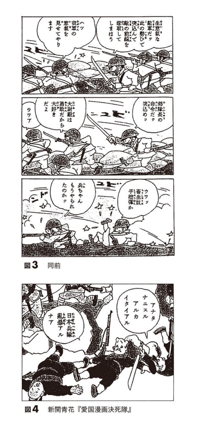 但是,在中国大陆开始的战争中,就在绘制这些漫画的同一时期,日军进行了南京大屠杀(因为不知道确切的受害者人数就说屠杀不存在,我完全不这么认为)。当漫画用刺刀刺向中国士兵,对方叫着“好痛”,拔出来大家都跌个屁股墩这种形式来描绘战争时,在中国本土,包括南京大屠杀在内,正在进行着真正的杀人战争。这种赞美战争的漫画通过“符号性”地描绘战争行为,在读者身上起到了掩盖战争中人真的会死这一理所当然的“现实”的作用。“敌”方士兵只会叫“好痛”然后“投降”,绝不会被杀,更不用说日军士兵连一点伤都不会受。这和米老鼠从高处掉下来,陷进地里、被压扁、缠上绷带,瞬间就能恢复原状是一样的。