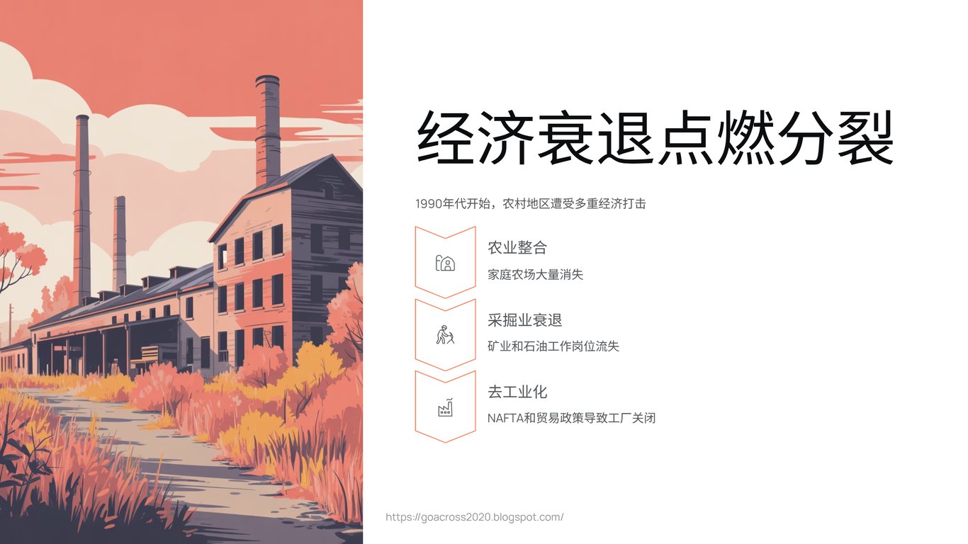 当历史学家和政治学者回溯这场大分裂的源头时,他们的目光总会聚焦在经济的结构性变迁上。从1980年代开始,一股席卷全球的浪潮——农业集约化、采矿等资源开采行业的衰落,以及更为致命的“去工业化”——开始猛烈冲击美国乡村。家庭农场消失了,矿井关闭了,曾经支撑着小镇命脉的工厂,在《北美自由贸易协定》(NAFTA)等政策的推动下,也纷纷外迁。