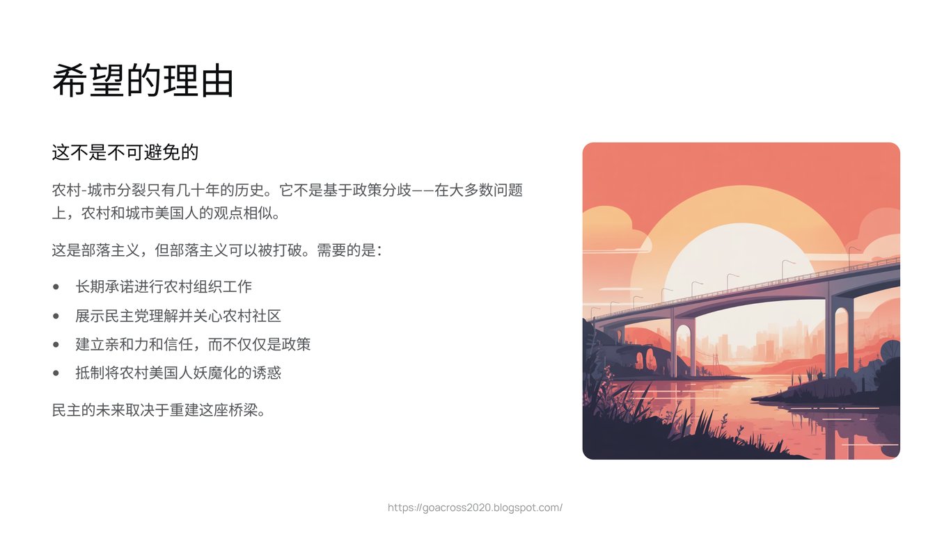 这无疑是一条艰难而漫长的道路。在一个被愤怒和猜忌浸透的政治环境中,重建桥梁,远比隔岸喊话要困难得多。然而,这或许是唯一的选择。因为这场城乡分裂,所威胁的早已不仅是某个政党的未来,而是整个美国民主实验的根基。当一个国家的人民,不再能想象与“另一边”的人们生活在同一个政治共同体中时,维系这个国家的纽带,也就到了最危险的时刻。