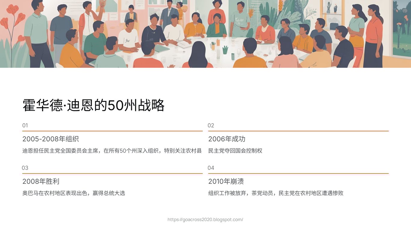 答案或许藏在霍华德·迪恩(Howard Dean)在2005年担任民主党全国委员会主席时推行的“50州战略”(50-state strategy)中。他的核心理念是:民主党必须在每一个地方,无论多么“红”,都进行深度的、长期的、全天候的组织工作。这无关乎一朝一夕的选举成败,而关乎重建信任与联系的漫长过程。这意味着,要真正地倾听,而不是仅仅去“教育”;要派驻全职的组织者,而不是在选举前夕空投传单。