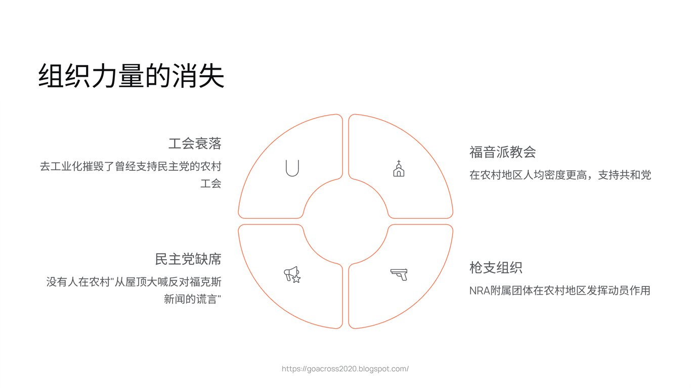 与此同时,共和党则受益于一个强大的、早已根植于乡村社区的组织生态系统——福音派教会和与全国步枪协会(NRA)相关的枪支团体。这些组织,与福克斯新闻、谈话电台等构成的保守派媒体矩阵相结合,成为了乡村地区信息与意义的主要塑造者。他们为人们的困境提供了一套简单、一致且极具煽动性的解释:一切问题,都源于遥远的、道德败坏的、不尊重你们的民主党。