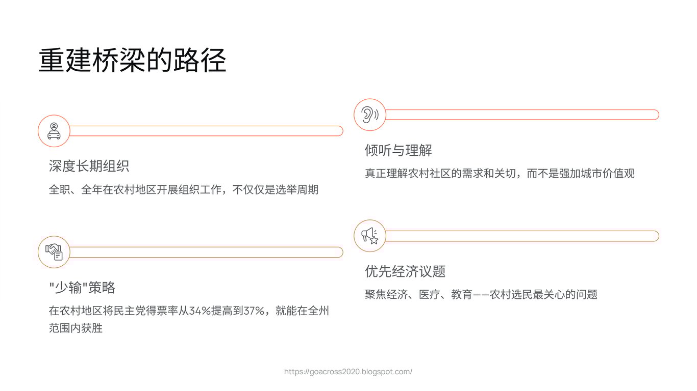 这是一种“积小败为大胜”(losing by less)的战略。在深红的乡村地区,将民主党的得票率从34%提升到37%,看似微不足道,但在势均力敌的全州选举中,无数个这样的“3%”累加起来,就足以决定一位州长或参议员的命运。更重要的是,它向被遗忘的社区传递了一个强有力的信号:你们没有被放弃,你们的声音依然重要。