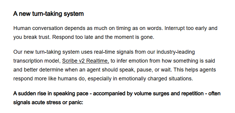 如果使用過現在主流AI Chatbot的語音功能,會發現到目前的語音回覆生成非常「有情緒」。只是在某些地方轉折或者是被barge-in中斷的時候稍稍不自然。以下連結是 ElevenLabs在20260211發佈的ElevenAgents: Expressive Mode Demo。直接把熒幕關起來盲聽試試,你會懂我在說什麼。