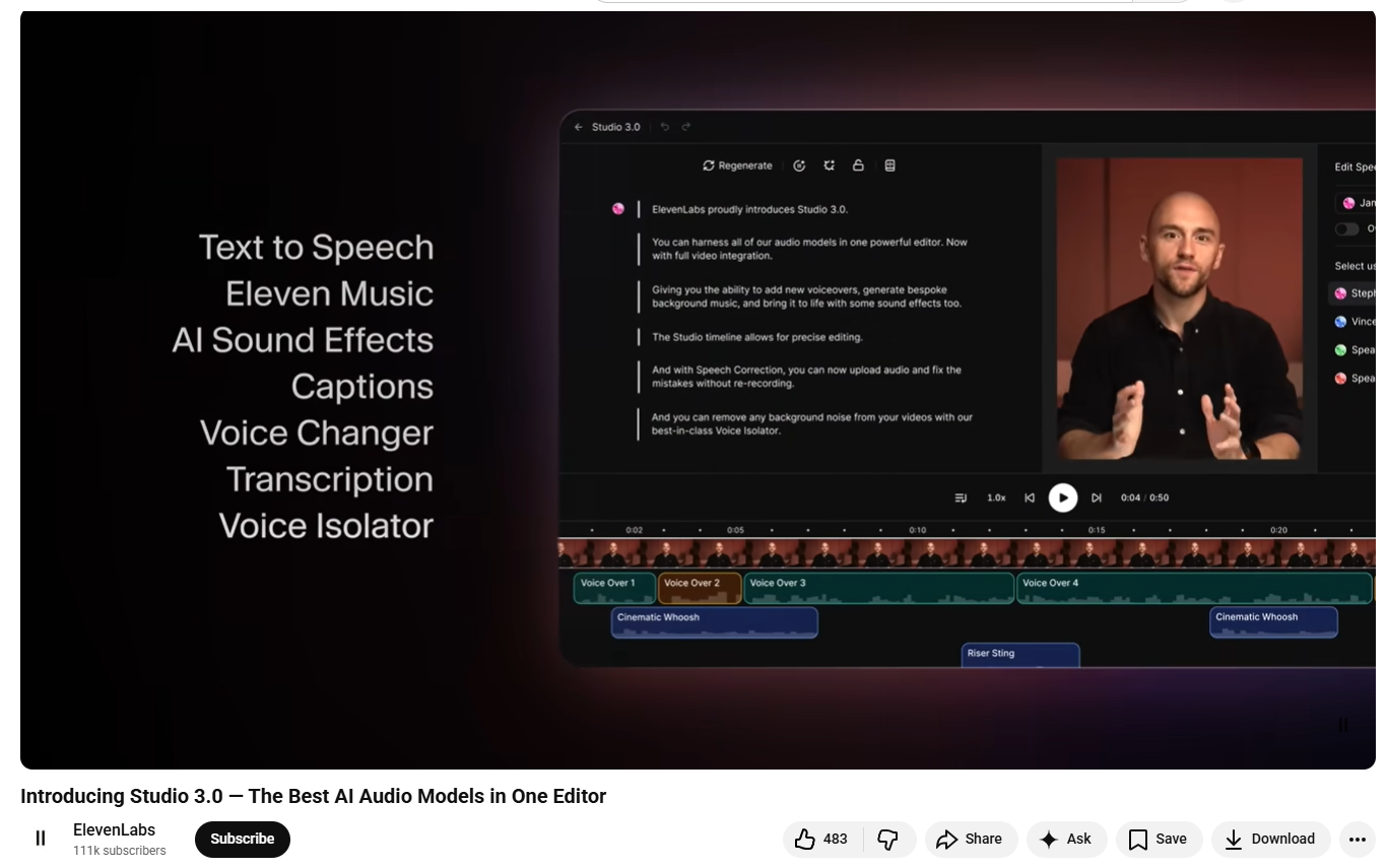 除了一般TTS(Text-to-Speech)、語音轉文字(Speech-to-Text);還有音樂生成、對話生成(Text to Dialogue)、影片/圖片生成整合、專業配音工具(Dubbing、Voiceover Studio)等強大功能。對於YouTuber、影視後製、遊戲、播客、有聲書、企業客服、行銷內容創作等來說,不用顧人(聲優)的成本和真人服務配合的時間,的確是如虎添翼。