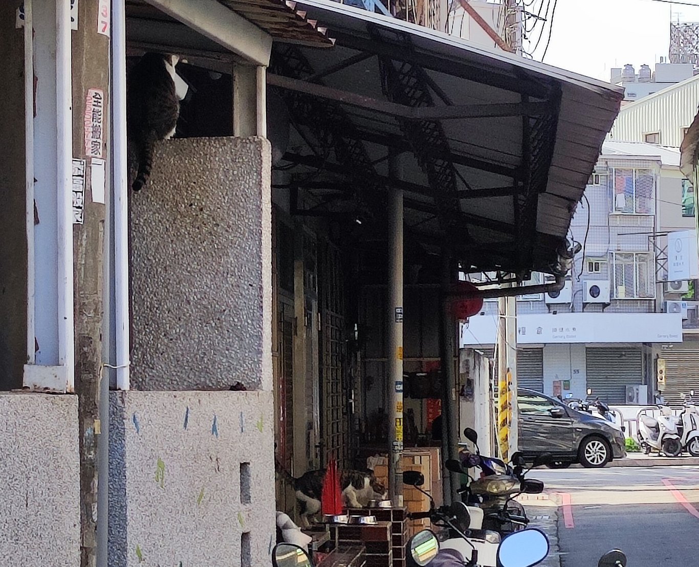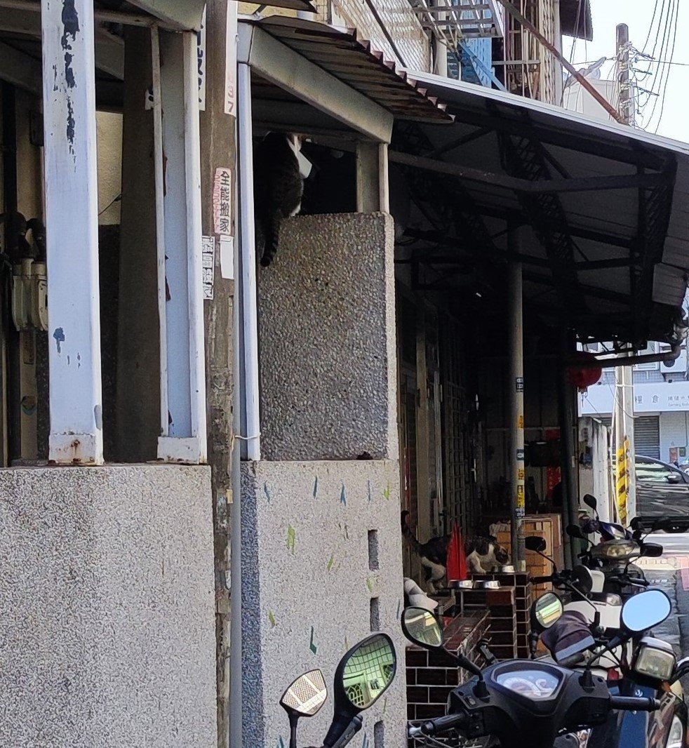 搭配插圖是前幾天白天時,三花在對面阿姨家圍牆柱子上吃飯時,有隻比較少見的貓,從隔壁圍牆往上跳,在往後面巷子走過去的時候,被我拍到的照片。
