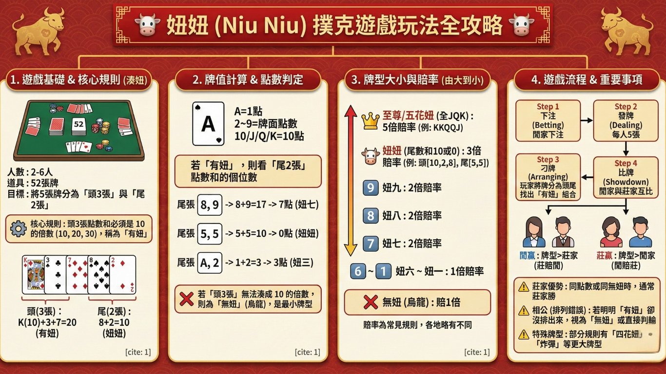 核心規則: 每人發 5 張牌,只要其中 3 張能湊成 10 的倍數(例如 J、Q、K 算 10,搭配一張 10),就叫做「有妞」。剩下兩張相加看點數比大小。