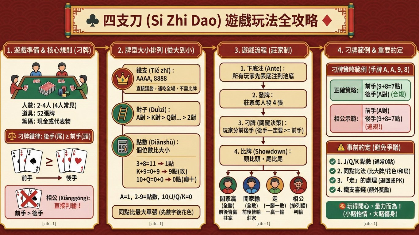 核心規則: 每人發 4 張牌,分成前後兩墩(兩張一組)。你必須要把牌湊成刁牌(兩張一樣)或點數最大。重點在於「喊注」,就算你拿到爛牌,只要你敢演,把別人嚇跑,錢就是你的(這種玩法通常比較刺激,但也有其他玩法直接開牌比大小的)。記得要先說好遊戲玩法才不會吵架唷!