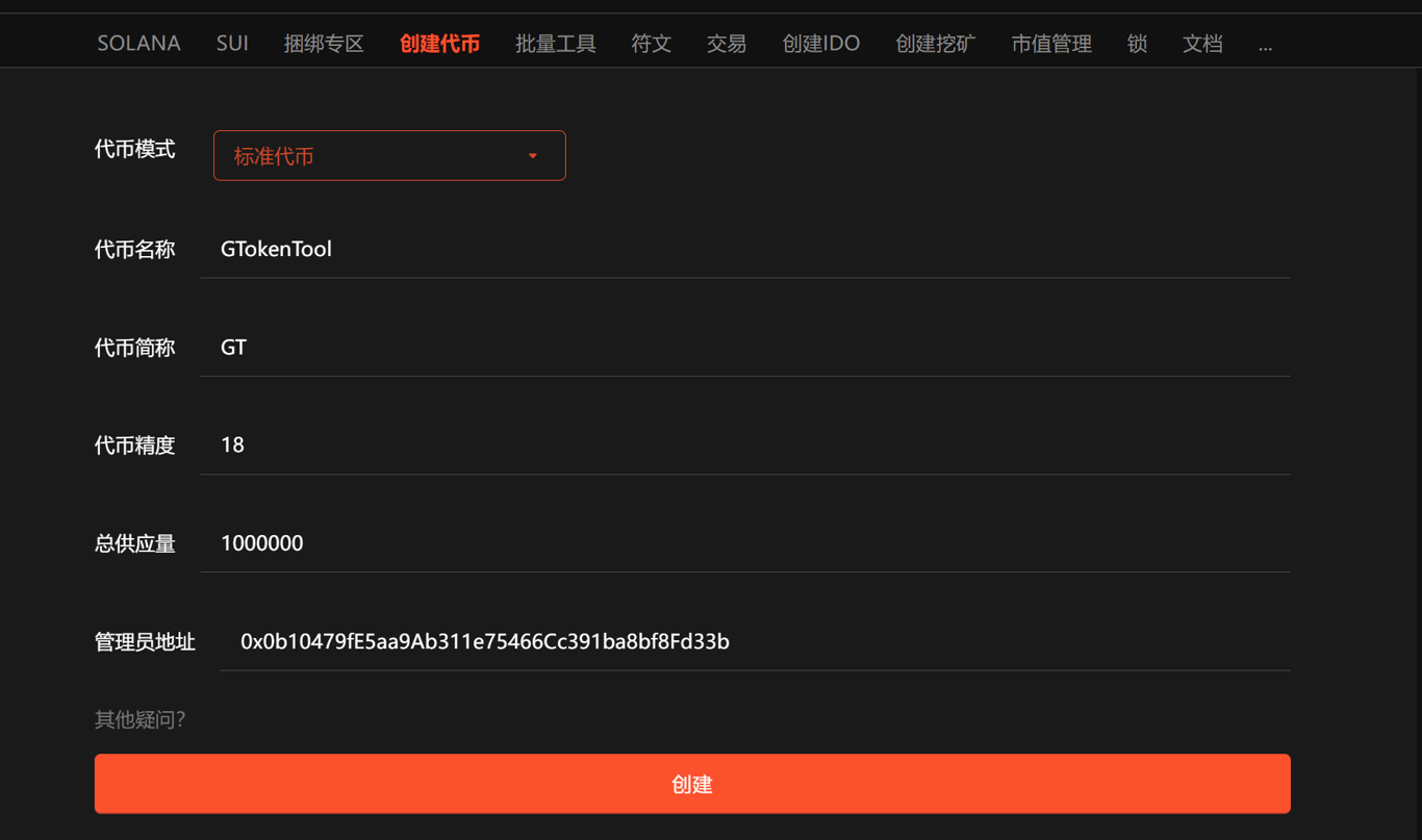 依次填写代币信息,假设我们创建一个代币叫 — — “GTokenTool”,填写如下: