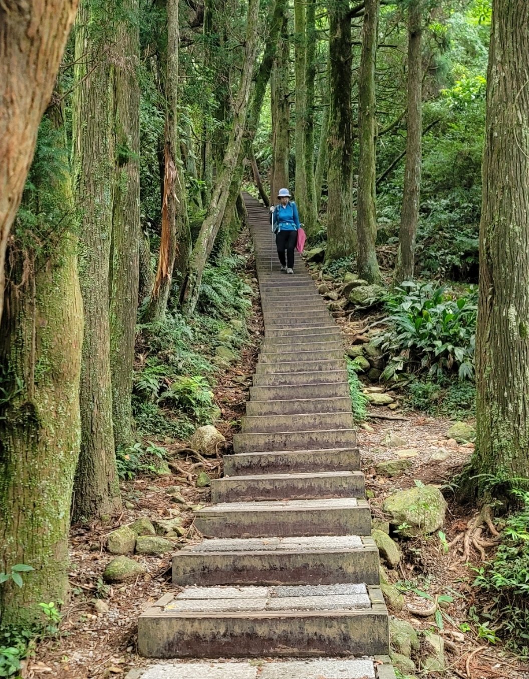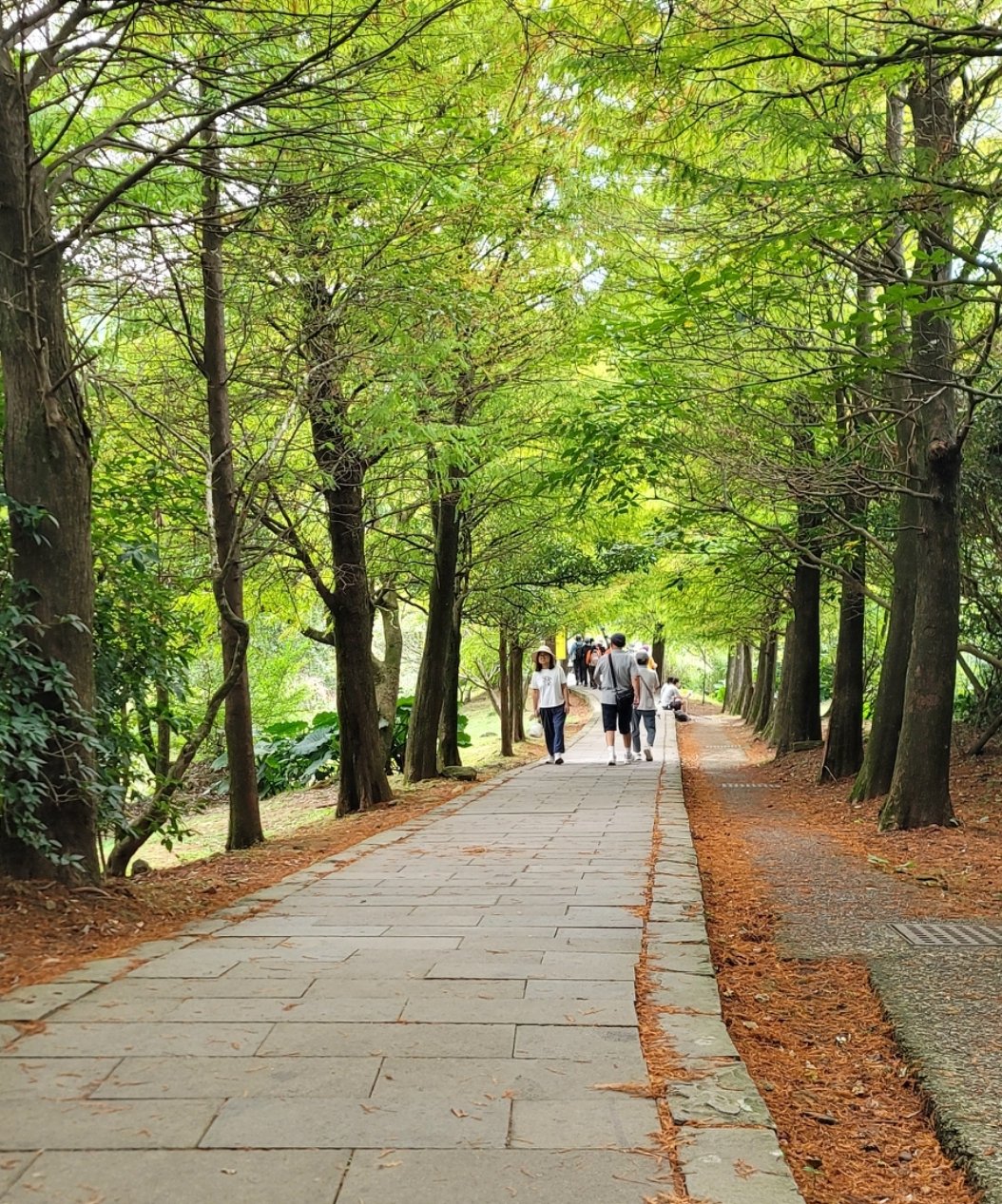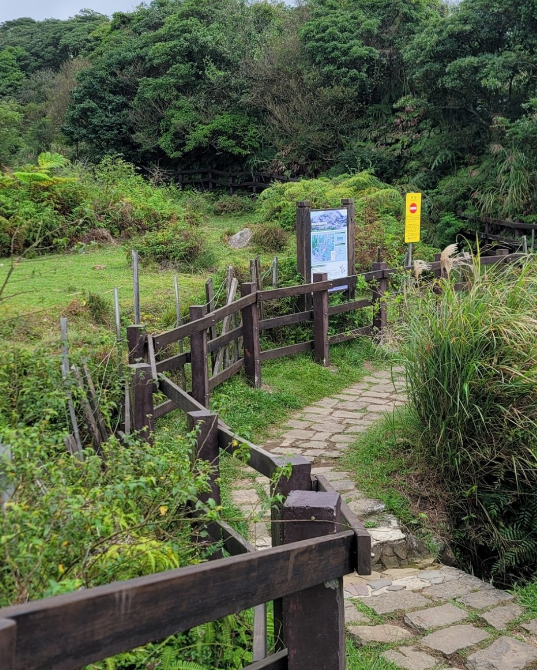 冷水坑到擎天崗約1.8公里,一進入步道,即看到牛奶湖指標,左轉約20公尺步道階梯,走上平台觀賞牛奶湖。看完牛奶湖回到步道,往前行,兩旁種植一排落羽松,青青翠綠的落雨松,很是美麗。往擎天崗的步道有上下坡,坡度不陡,適合大人小孩,生長在都市叢林的你我,來趟噴汗呼吸氛多精的充氧之行。