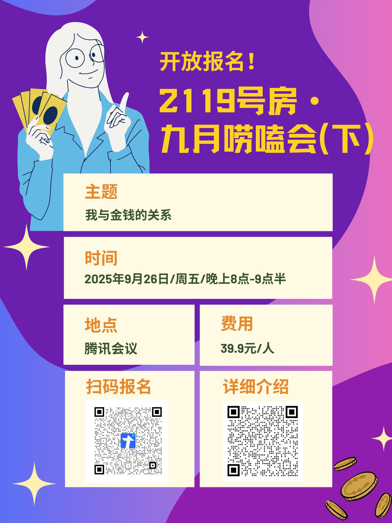 我与金钱的关系 | 「2119号房·九月唠嗑会(下)」开放报名!郭享玖·9 月 21 日·IPFS2025年9月26日周五晚上8点-9点半,腾讯会议 CC BY-NC-ND 4.0 授权建议频道选择希望推荐到的频道(单选)生活事书音影旅・居性别/爱创作・小说时事・趋势身心灵没有适合的频道不参与频道推荐 (文章将出现在「还有」中)下一步喜欢我的作品吗?别忘了给予支持与赞赏,让我知道在创作的路上有你陪伴,一起延续这份热忱!支持作者支持作者郭享玖我的文字是我認識我自己的方式和過程。 来自作者相关推荐对自己有信心是怎样的一种感觉?钱不是大风刮来的,什么是有觉知的消费?| 21119号房·九月唠嗑会(上)开放报名去创造自己喜欢和想做的工作?