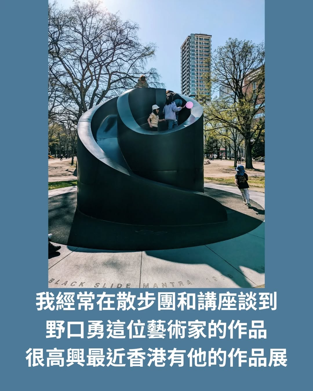 之前曾在這兒介紹,世上我最喜愛的空間之一,必然要數到在北海道札幌的「莫埃來沼公園」,它由藝術家野口勇設計。這位雕塑家的思考,對遊樂空間和公園影響深遠,近年每次在西九帶散步團,我也特意帶大家去M+的平台看他好好玩的作品。