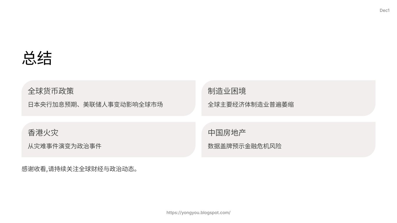 日本央行暗示12月加息、香港大火政治化、中国停止公布房屋销售数据:全球金融与政治风险全解析(12月1日)