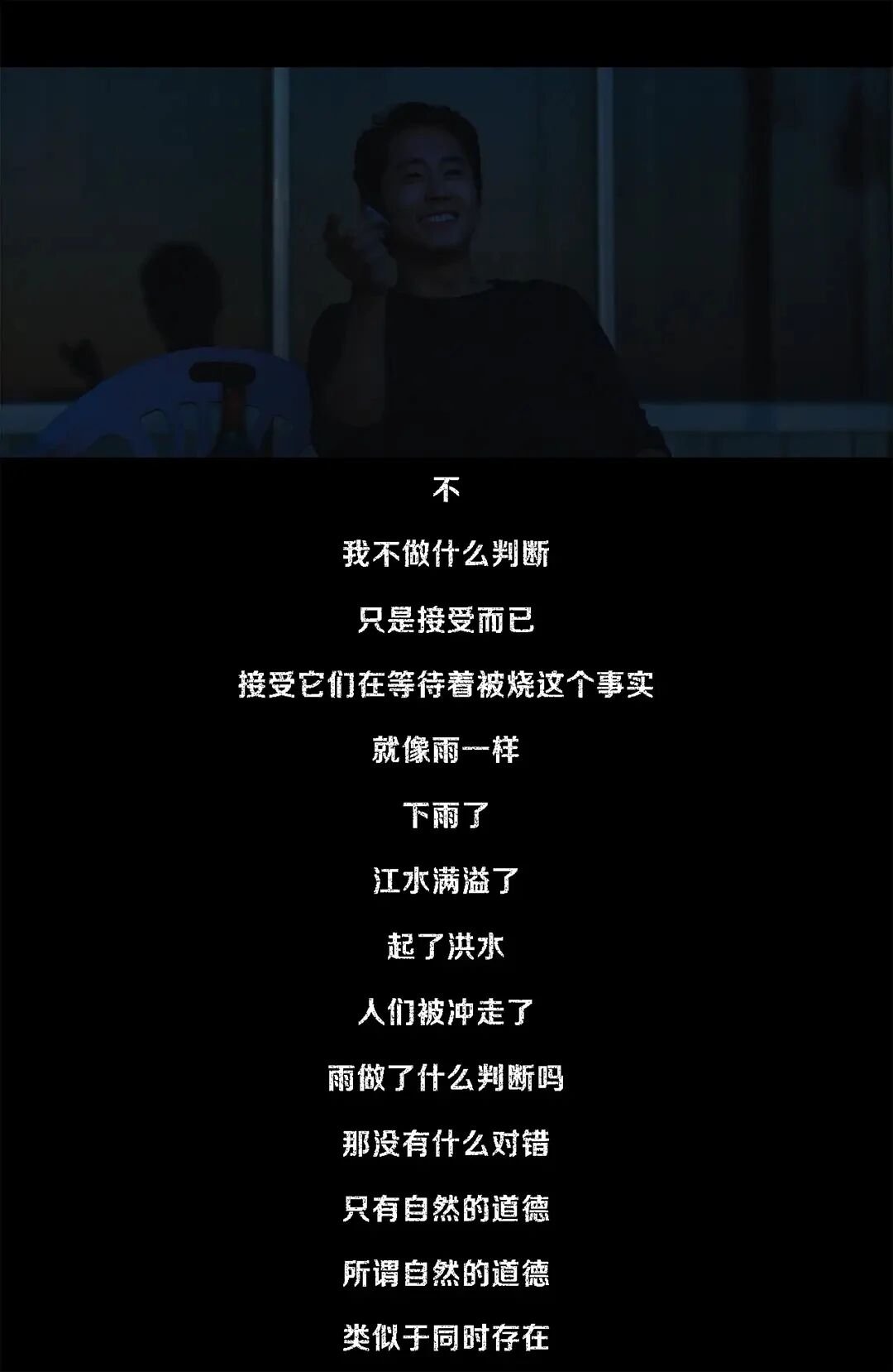 李滄東最初的職業是教師兼職作家,他在觀察韓國社會的這些年里融入了自己的理解,借由《燒倉房》和《燒馬棚》的想象空間和隱喻無限延伸,用自己詩意的鏡頭語言和獨特的哲學思想為我們展示了這一幅韓國青年的畫卷。