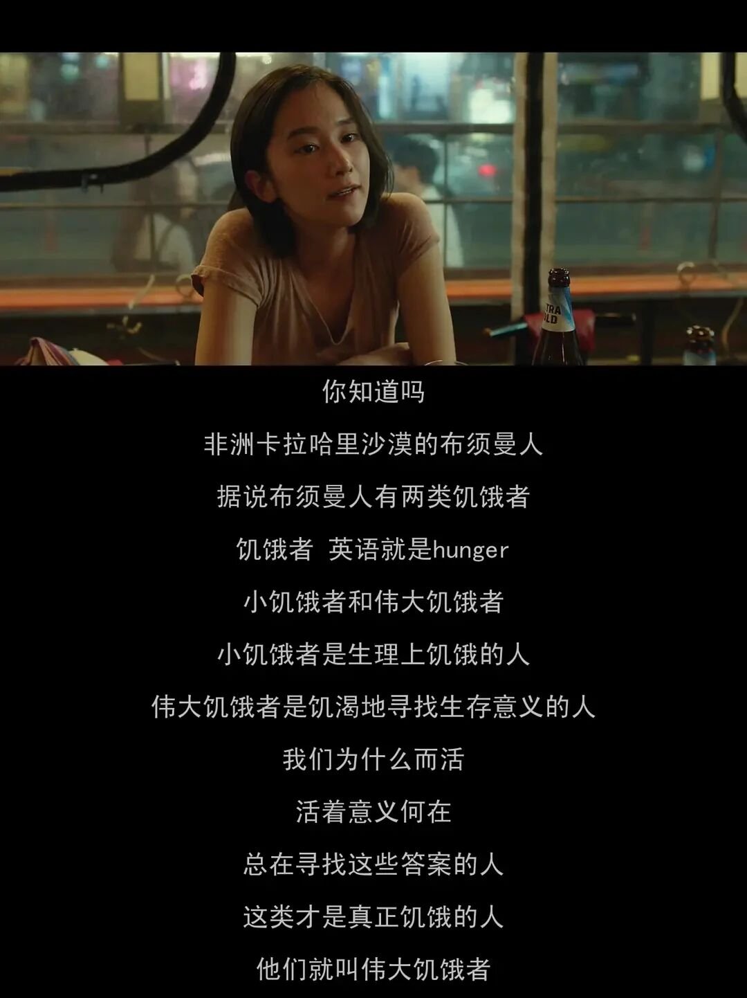 影片刻畫了三個不同階級不同類型的“無業遊民”——宗秀、海美和本,並通過這三個人探討了一個關於“小飢餓者”和“大飢餓者”之間的關係,這兩個概念是片中海美提到的布須曼人的論斷,小飢餓者是生理上飢餓的人,偉大的飢餓者是飢渴地去尋找生存意義的人,也就是真正飢餓的人。