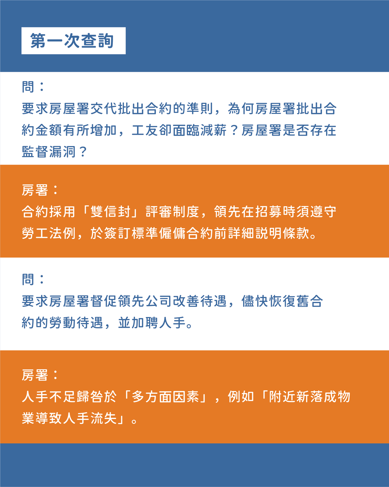 兩次回覆顯示,房署僅以「公司已遵守最低勞工法例」作回應,並以程序和制度來推責,卻完全迴避核心問題——為何合約金額增加,工友待遇卻下降?勞工法例只是最低底線,並不足以防止外判公司「加價減薪」。房署冷處理態度,不但未能履行監督責任,更放任承辦商犧牲工友權益,令人失望。
