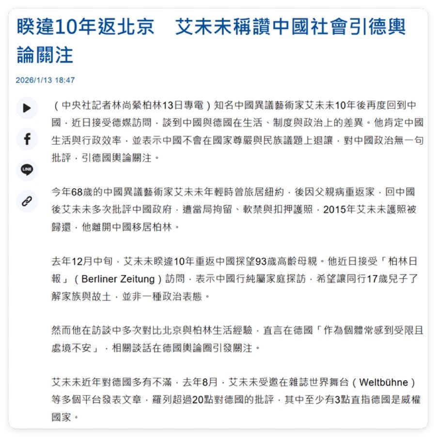 1月13日,艾未未回北京后首次公开接受采访(柏林日报),批评德国各种问题,对中国无一句批评。很显然,艾未未底色从没变,就是红二代权贵。而且缺乏道德。他干了一些有益社会的事,只是他某种爱好,而非真正的责任心。这货之所以能搞起风浪,也是靠了特权身份。