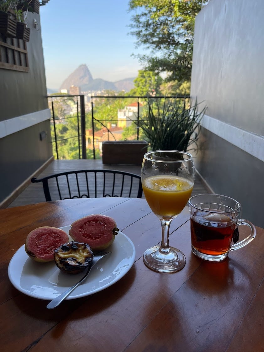 在聖特蕾薩醒來,失眠班機造成的舟車勞頓感已消去大半。 拉開窗簾便看見里約的標誌——相鄰的烏爾卡山與糖麵包山(Morro da Urca; Pão de Açúcar)沐浴在晨光中。 徐徐洗漱,燒水泡茶,備好早餐,拿到與廚門相通的微涼露臺上享受。